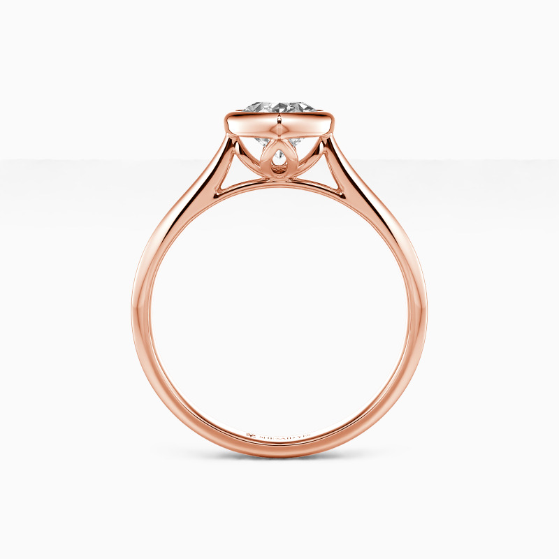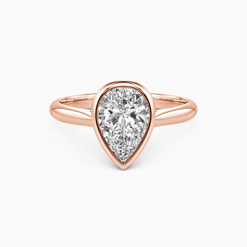 A simple-designed engagement ring captures its brilliance from a fabulous pear-cut center stone. The polished bezel wrapped the gem tightly on the sleek tapered shank, creating a balanced beauty with a minimalist style. The best choice for your beloved lady.