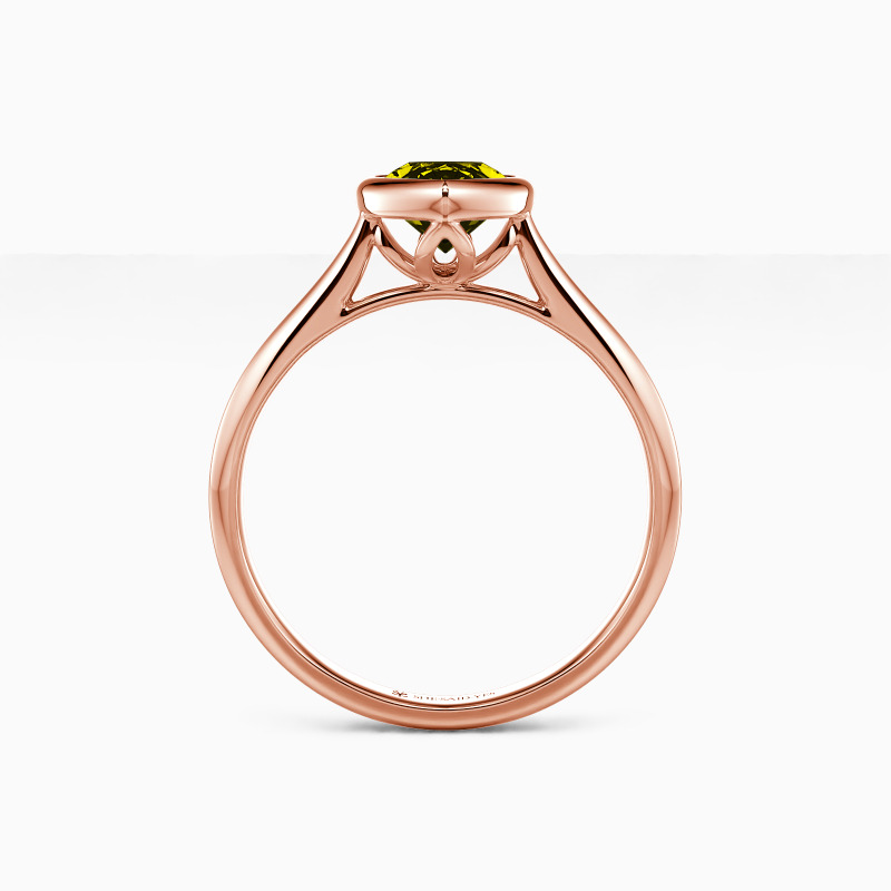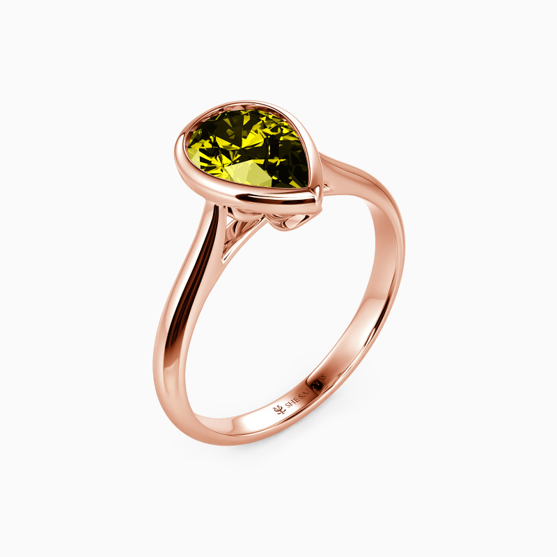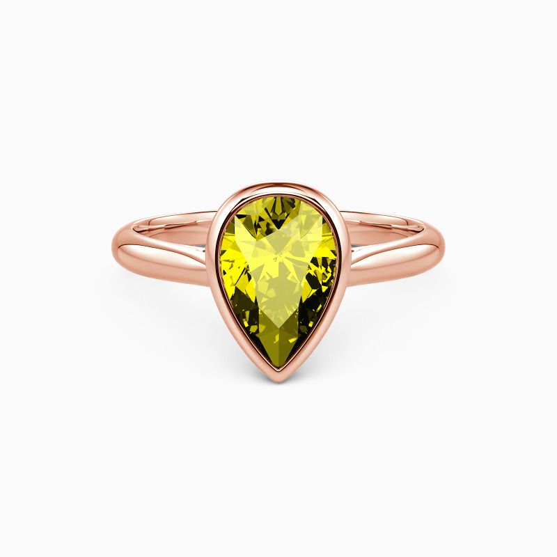 A simple-designed engagement ring captures its brilliance from a fabulous pear-cut center stone. The polished bezel wrapped the gem tightly on the sleek tapered shank, creating a balanced beauty with a minimalist style. The best choice for your beloved lady.