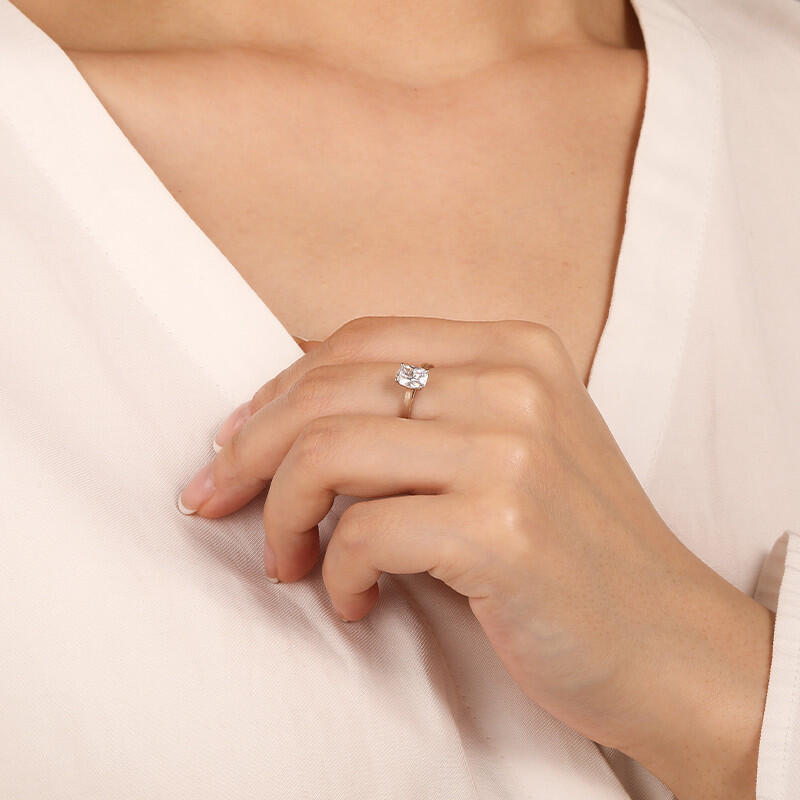 Simple yet divine, ask for her hand with this delicate solitaire. Standing tall in a traditional four-prong setting, a stylish Elongated Cushion center stone radiates exceptional sparkle. An amazing look for the woman you adore, this engagement ring is finished with a shining polished shine.