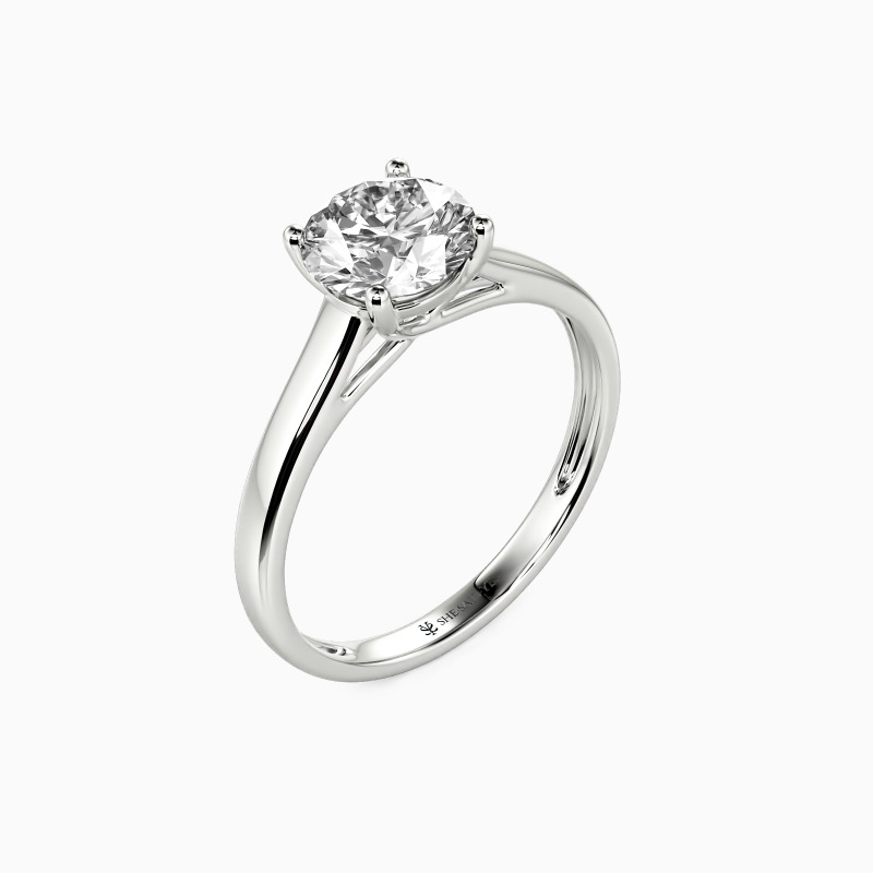 Simple yet divine, ask for her hand with this delicate solitaire. Standing tall in a traditional four-prong setting, a stylish round-cut center stone radiates exceptional sparkle. An amazing look for the woman you adore, this engagement ring is finished with a shining polished shine.