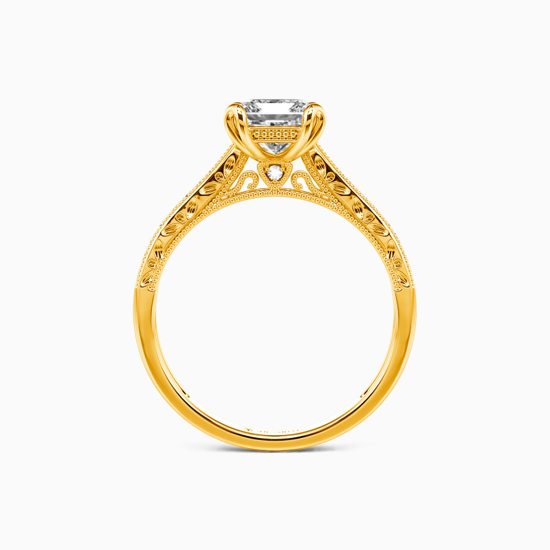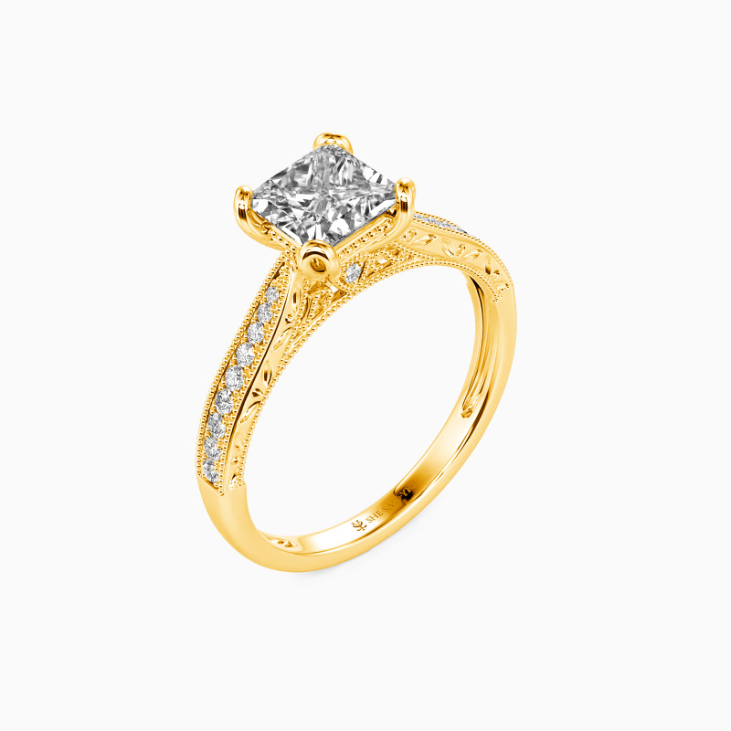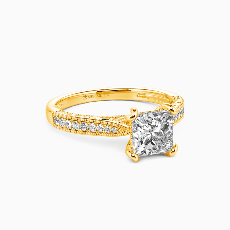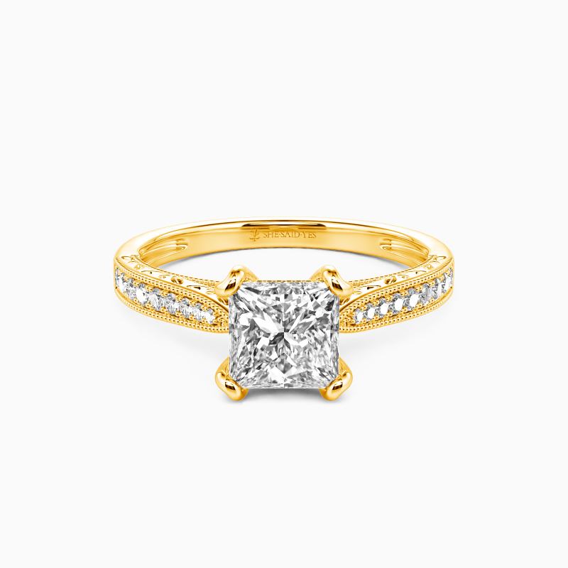 This modern classic side stone engagement ring features a glamorous princess-cut center stone held in a four-prong setting. A series of brilliant accents are studded on the tapered shank with detailed milgrain creating a stunning look for the gallery and whole ring. Enlighten your bright star when you propose with this romantic ring.