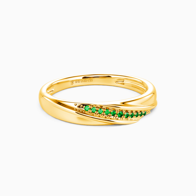 This wedding band holds a captivating charm with the small scintillating round-shaped accents encrusted in a pavé setting. And precious polished metal gives an extra brilliance to the overall look. You can wear it alone or pair it with your engagement ring to create a perfect bridal set.