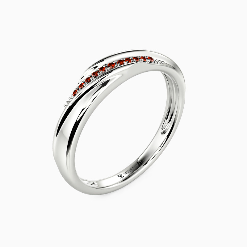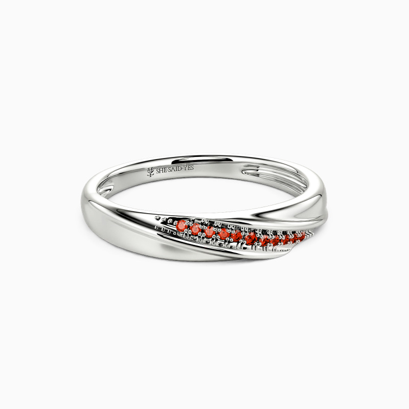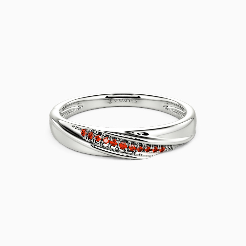 This wedding band holds a captivating charm with the small scintillating round-shaped accents encrusted in a pavé setting. And precious polished metal gives an extra brilliance to the overall look. You can wear it alone or pair it with your engagement ring to create a perfect bridal set.