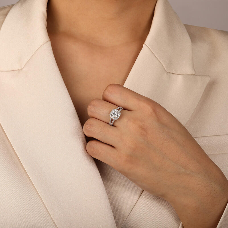 Round cut stone enveloped in the square shape halo, this engagement ring is a true work of art. A Karat gold split shank band completes this enchanting engagement ring.