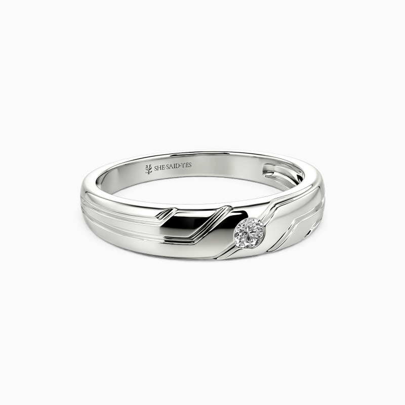 This men's band unveils a glimmering round-cut center stone studded in a bezel setting. And the engraved asymmetric patterns on the polished shank adds to its aesthetic look. When you walk down the aisle, I see my hope, my inspiration and my angel.