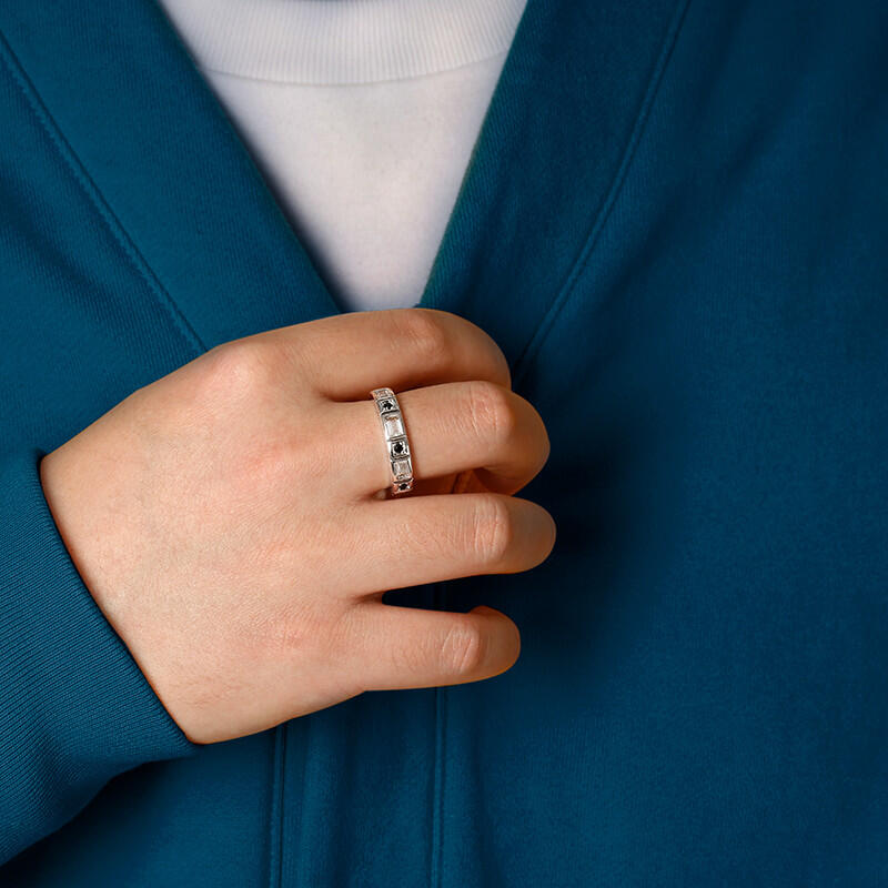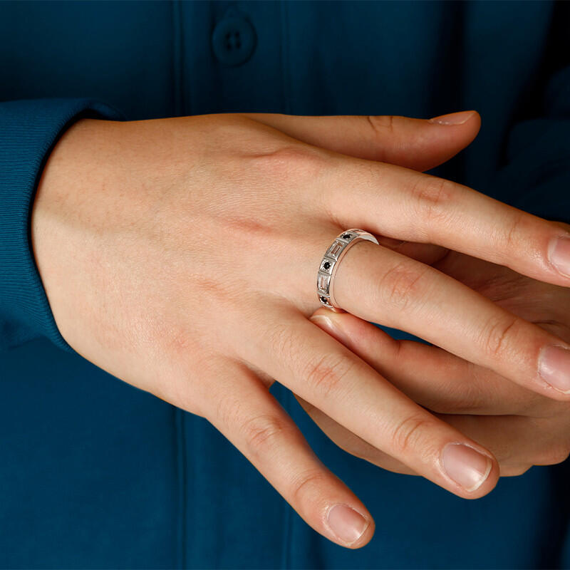 Captivating you with the trendy look and the luminous gloss, this wedding band is unique in design. Dotted with round and emerald-cut stones set tidily in every single frame to be a channel-like finish, it showcases an incredible radiance and a firm love towards your dearest one.