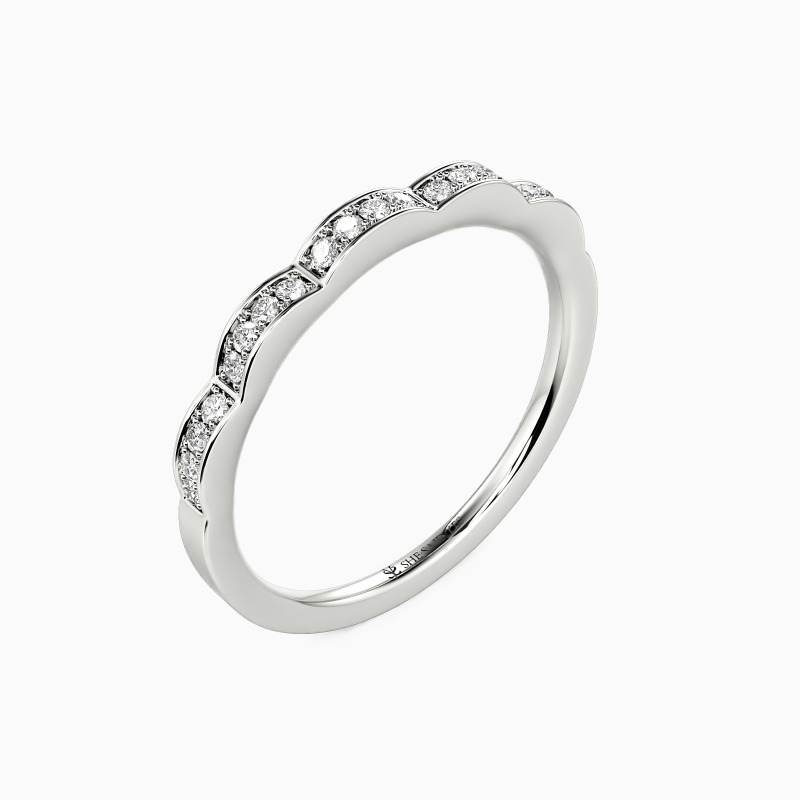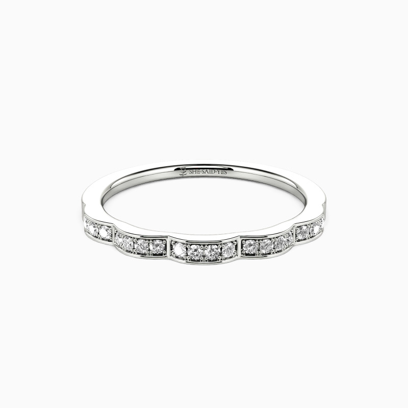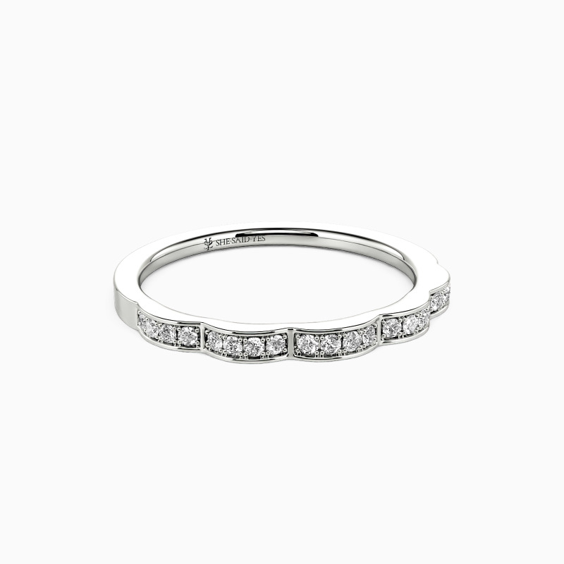 Regal, pristine, and with a touch of vintage detail—this artful wedding ring from SHE·SAID·YES is a modern vision. Dazzling round stones sparkle on the waved shank adds extra shimmer to this unique ring. This exceptional wedding ring will forever express your eternal love and undying commitment.