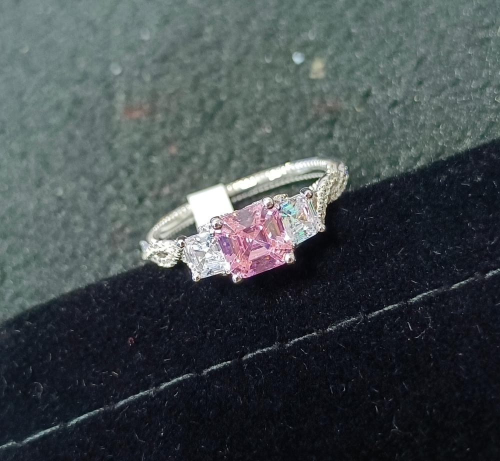 This three-stone ring crafted in luxurious style offers breathtaking beauty. A stunning asscher cut stone sits at the center flanked by smaller accents on each side. A twisted band lined with accent gems maximizes the brilliance. Intricate milgrain detailing lends vintage appeal to such aesthetic design. The SYS on the side is the eternal witness that the moment she said yes.