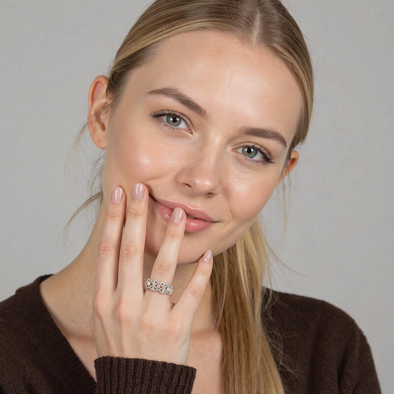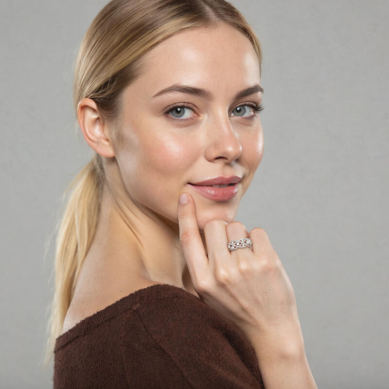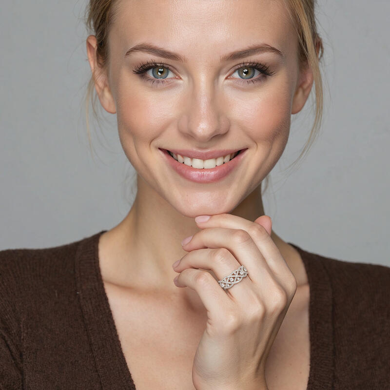 Dazzle you with the gorgeous look and stylish design. Several pavéd embellishments intertwine with each other, embracing the round-cut stones at the intersection. The overall crossover look symbolizes the dependence and trust between you. You are my pride and joy, and I’ll save your smile and this eternal moment with this ring.