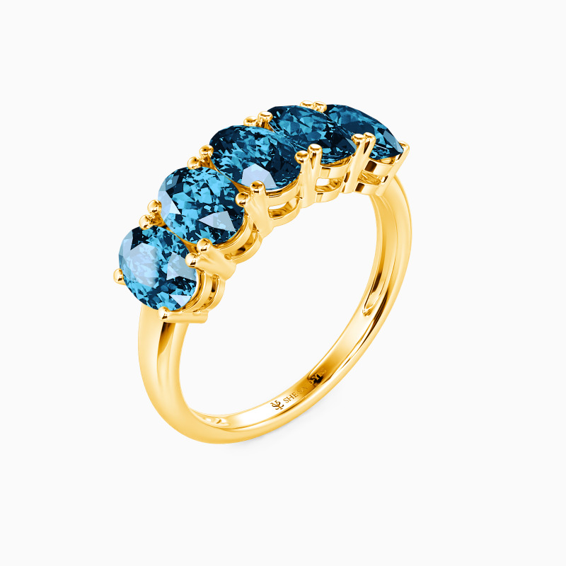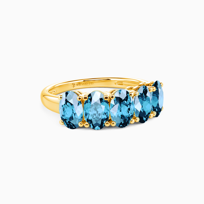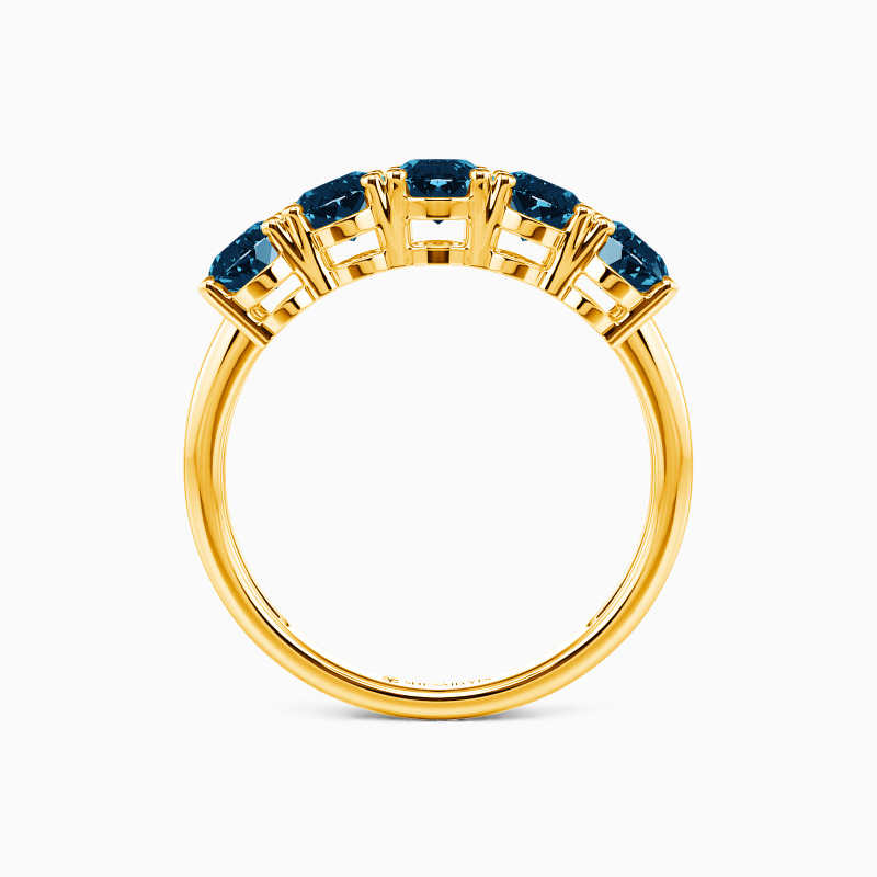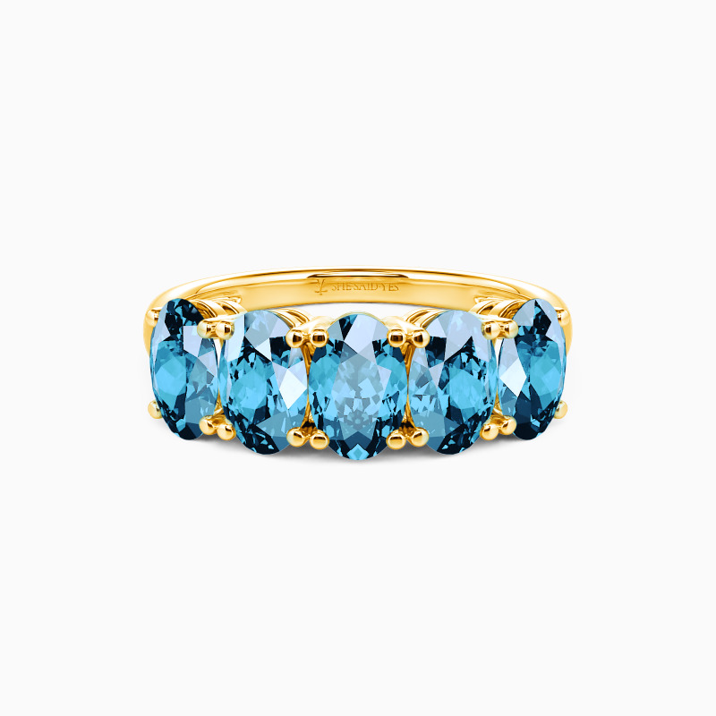 The classic five-stone design offers you a perfect wedding witness. Five brilliant oval-cut stones of equal size held in the polished shank create this minimalistic wedding ring. And the delicate prongs maximize the focus and light performance of gemstones. They add to the beauty of the ring and take it to the next level.