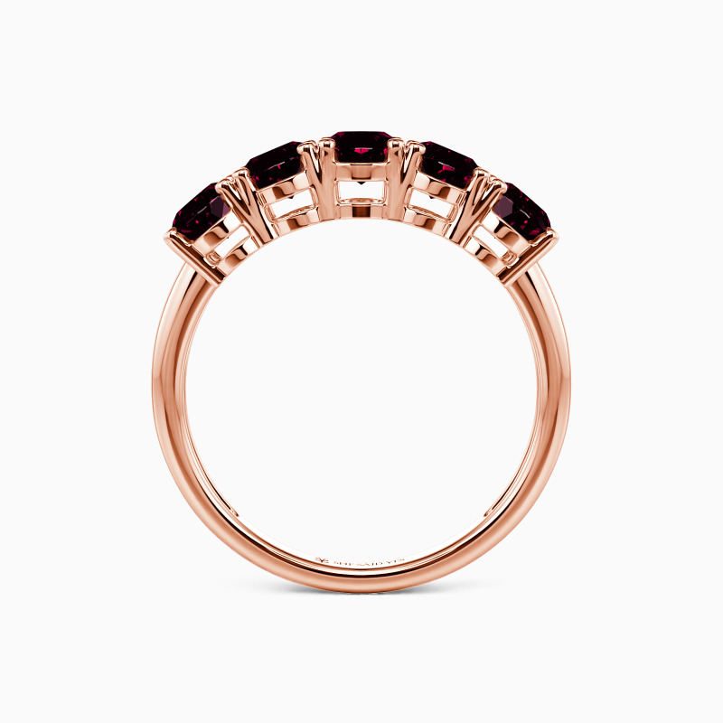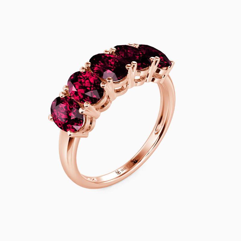 The classic five-stone design offers you a perfect wedding witness. Five brilliant oval-cut stones of equal size held in the polished shank create this minimalistic wedding ring. And the delicate prongs maximize the focus and light performance of gemstones. They add to the beauty of the ring and take it to the next level.