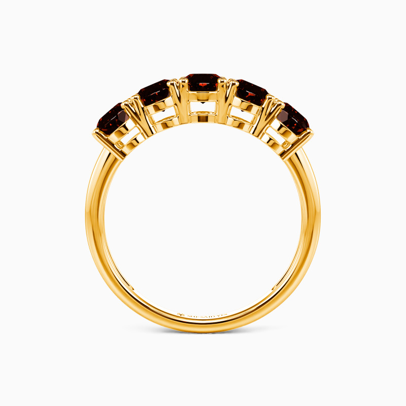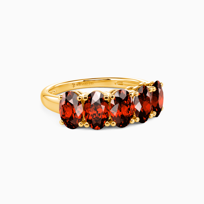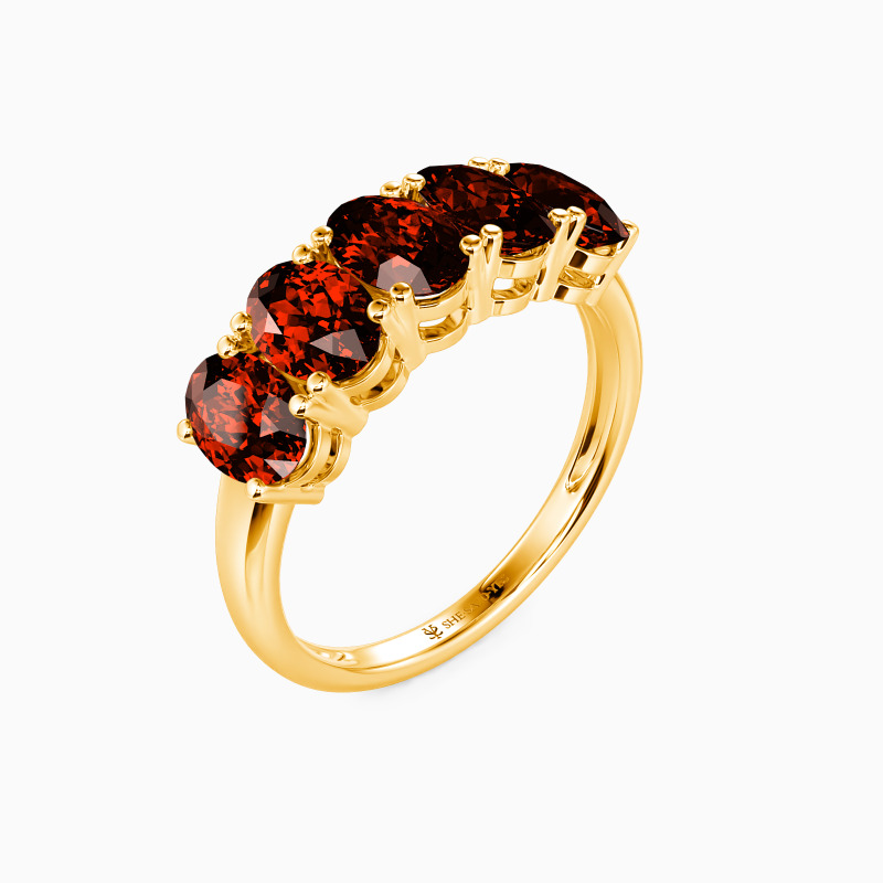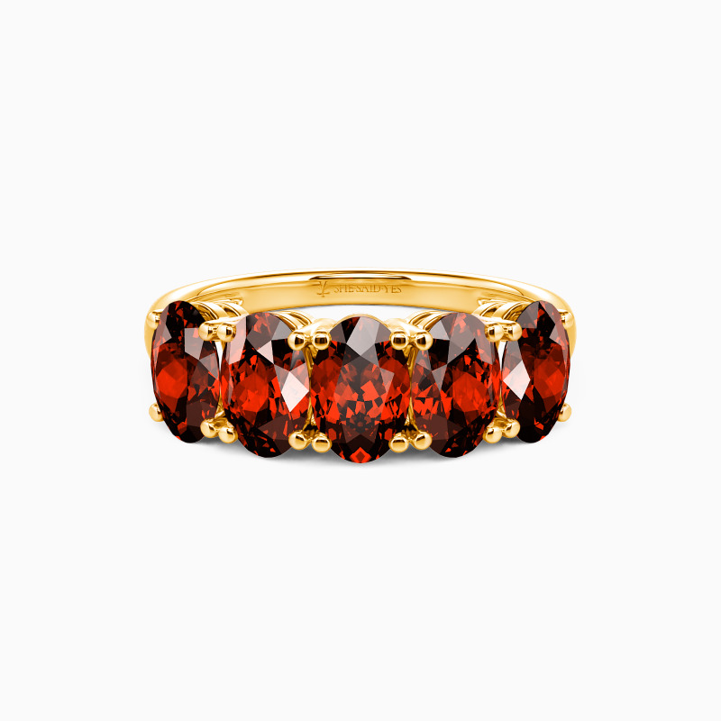 The classic five-stone design offers you a perfect wedding witness. Five brilliant oval-cut stones of equal size held in the polished shank create this minimalistic wedding ring. And the delicate prongs maximize the focus and light performance of gemstones. They add to the beauty of the ring and take it to the next level.