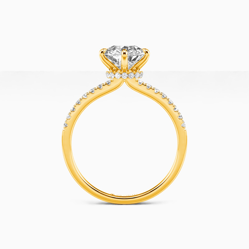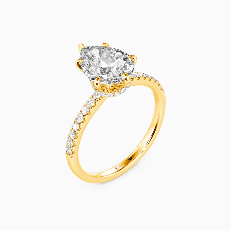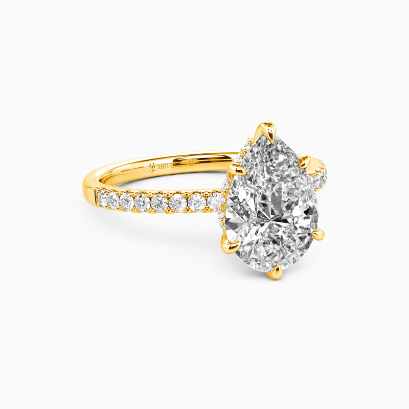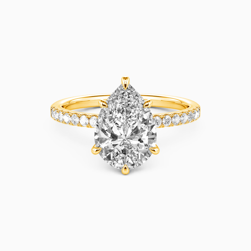 Featuring a row of pavé gems that guide the eyes inwards to the spectacular center stone, this fine engagement ring is designed to highlight the breathtaking brilliance of the pear-cut center stone. With an elegant pear frame secretly appearing underneath the core, this magnificent ring is a paragon of endless love.