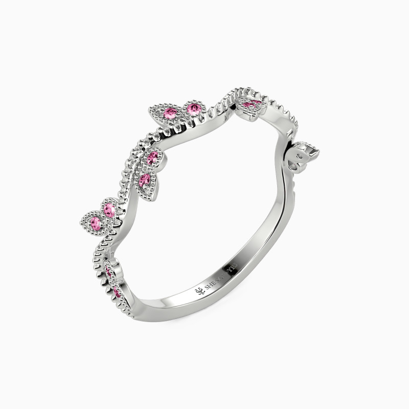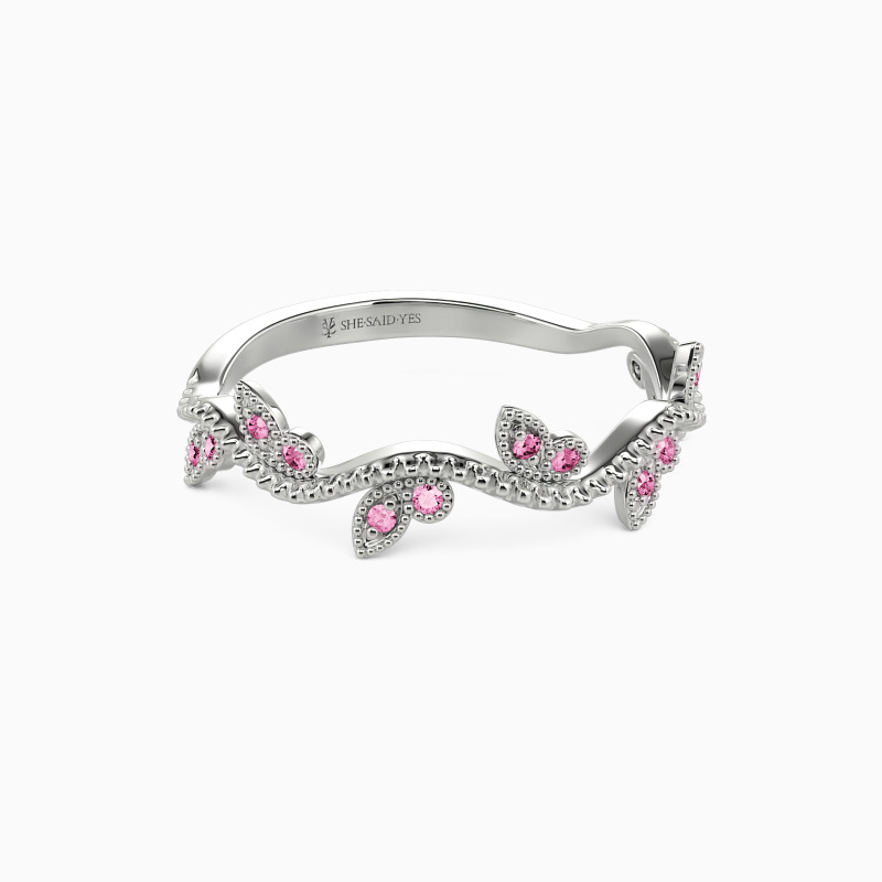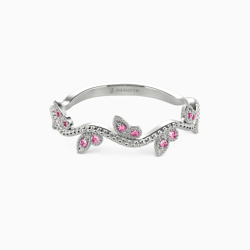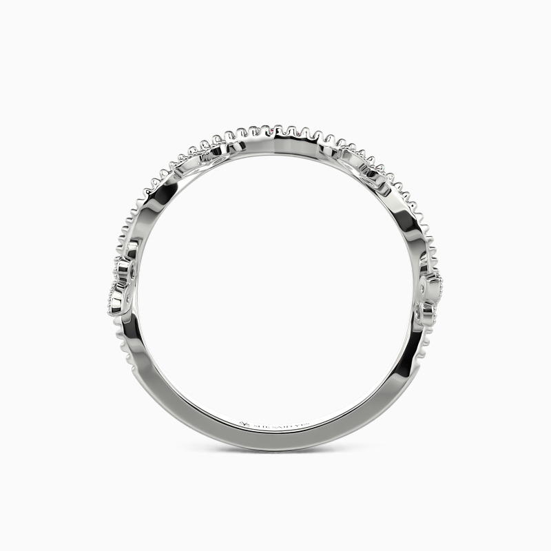 Alluring and stylish, the curved vine-like shank gives this classic wedding band a unique look. Brilliant round-cut accents are nestled in the milgrain frame provide a lovely flowing and growing feeling. This delicate and natural look will be stunning next to your engagement ring, creating the perfect bridal set.