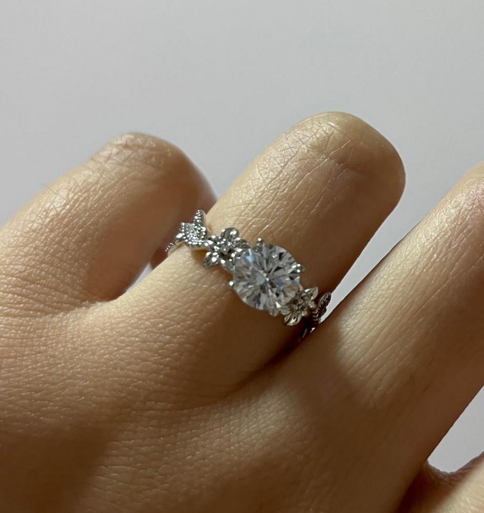 A charming round-cut center stone is surrounded by the floral and leaves pattern studded on the cathedral shank completing this magnificent side stone engagement ring. And tiny glistening accents with milgrain details enhance the overall look for a dash of splendor. You are my sunshine, and you make me happy when skies are gray.