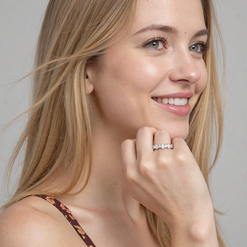 Write a new chapter of your life with this wedding ring. Nine pronged glittering stones embedded on the polished shank permit you to appreciate its brilliance from all angles. Alternating oval-cut and round-cut stones infuse a touch of modern charm to the design. It's also suitable for everyday wear.