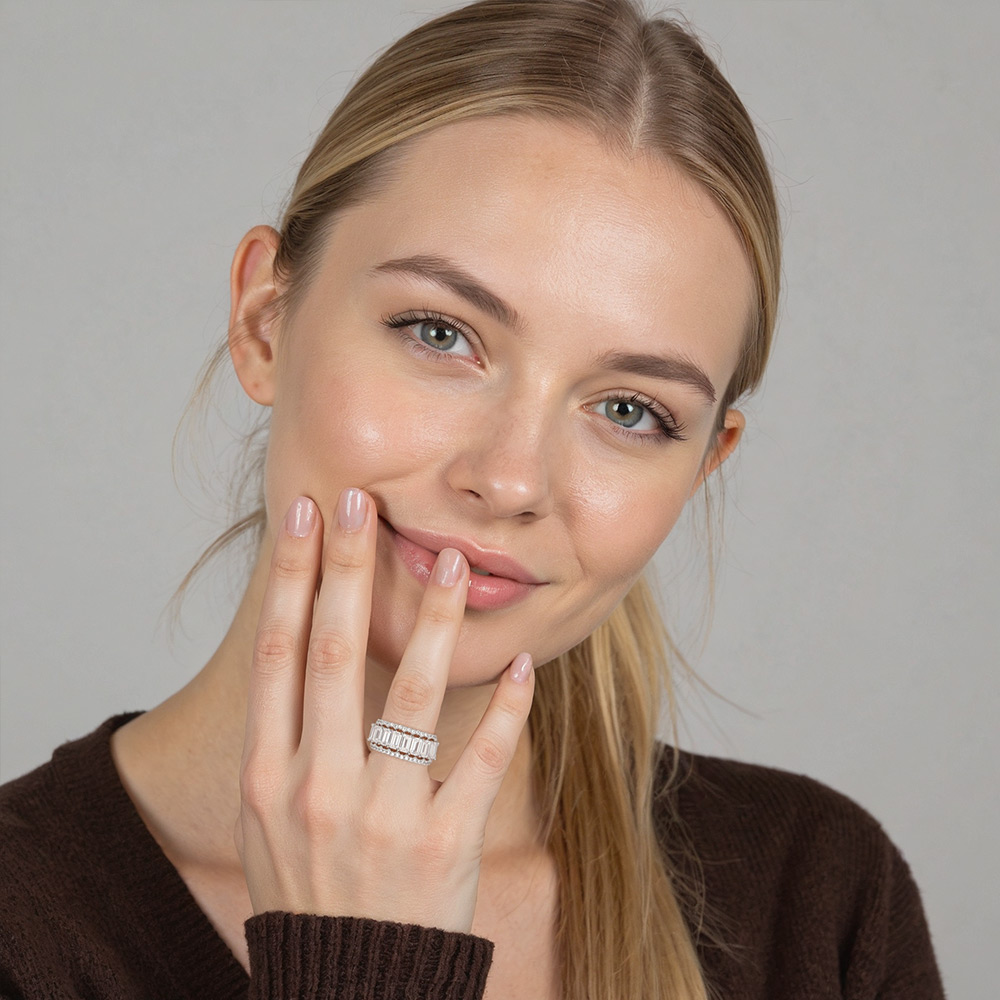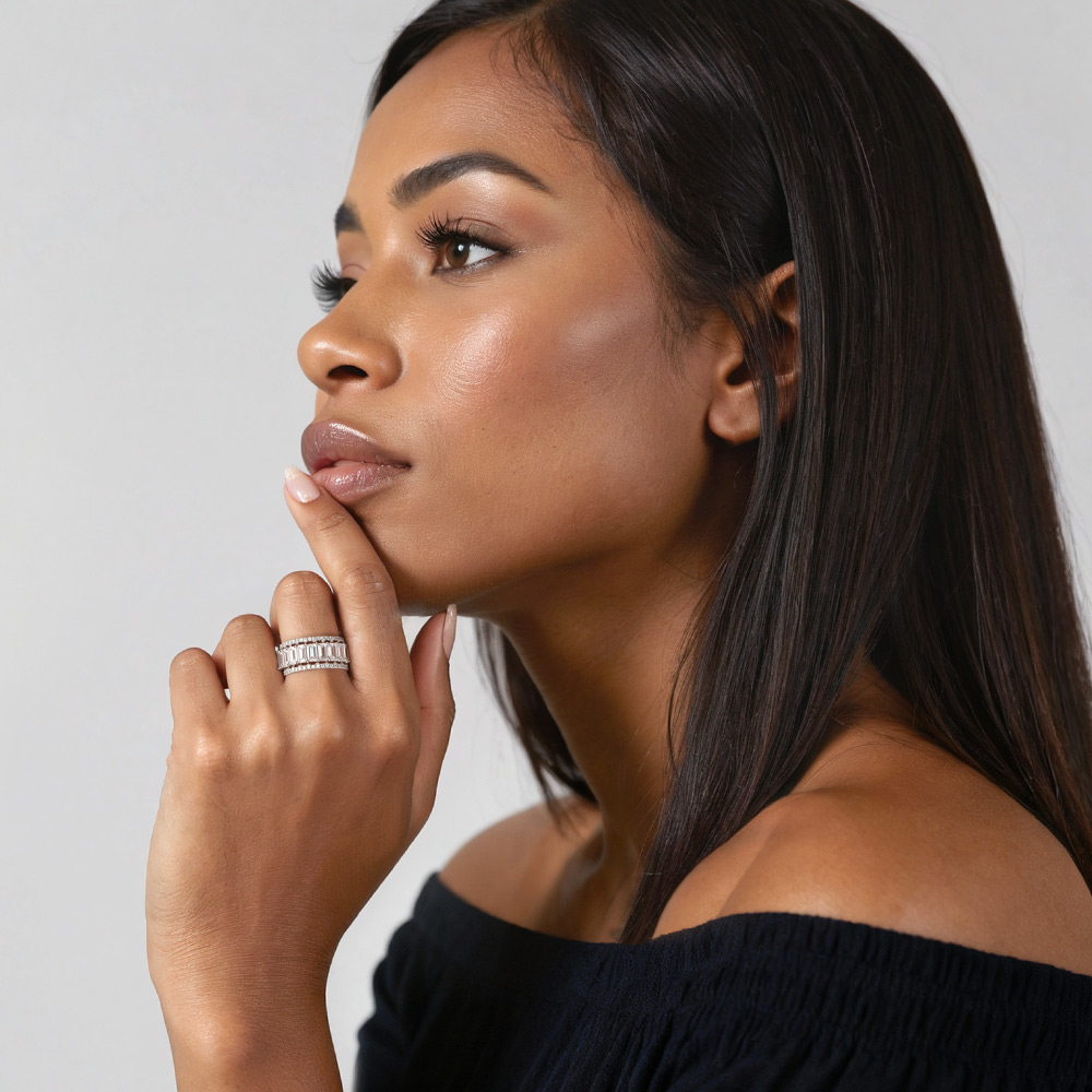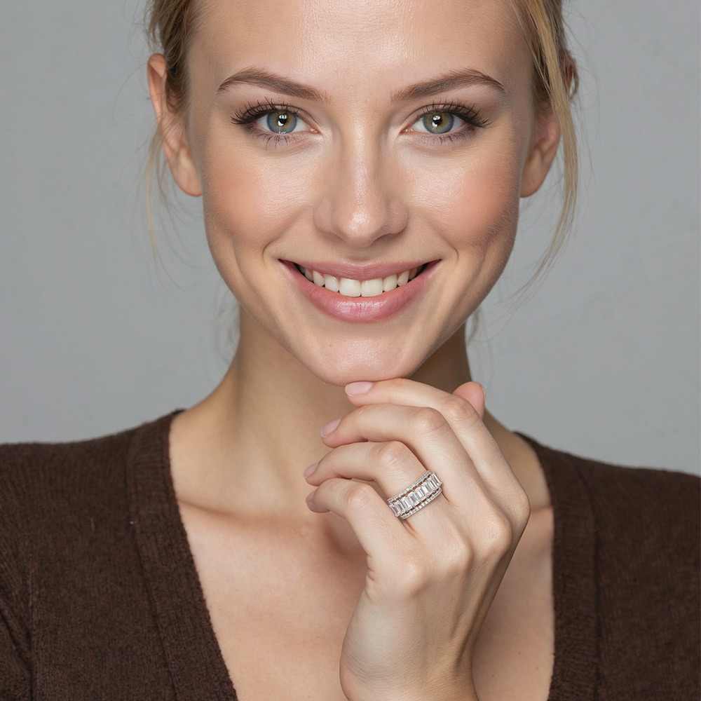 Nine fancy emerald-cut stones are held in the center to create a splendid look. And pavéd round-cut accents are embedded in the adjacent split shank to enhance the marvelous glamour. This unique design permits it to become the focus of your love statement for a lifetime.