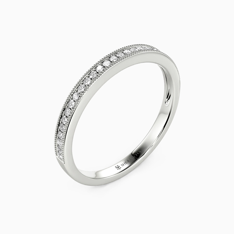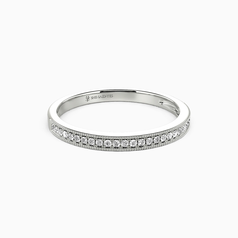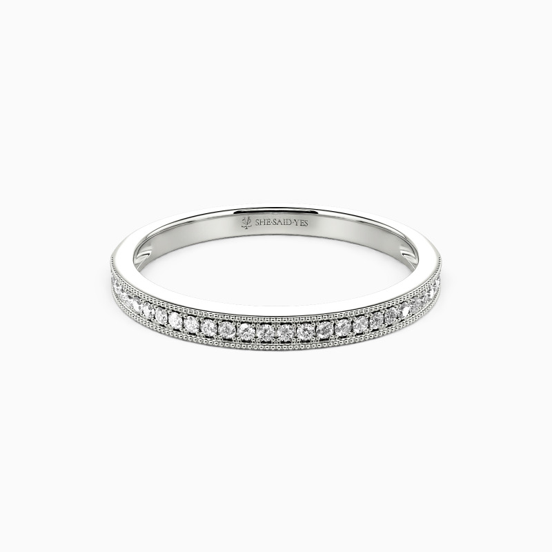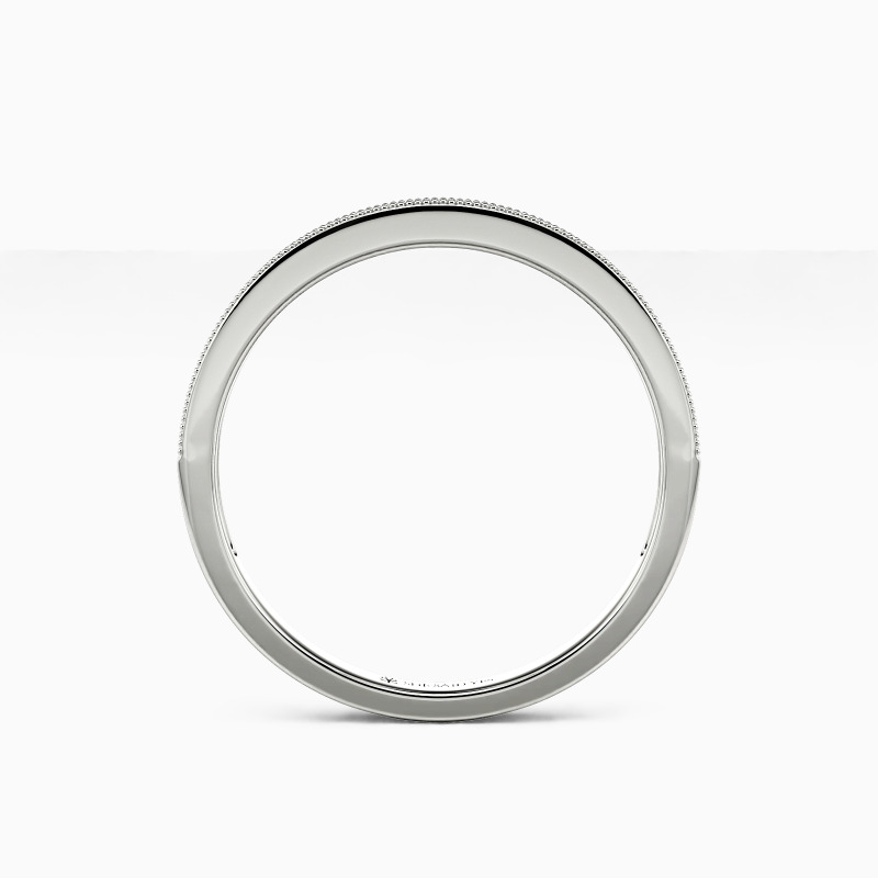 Nothing is more elegant than our striking semi-eternity wedding band. Featuring a row of shimmering round stones, it's surrounded by sophisticated milgrain along the edges. Always the right choice for your big day.
