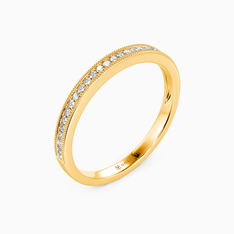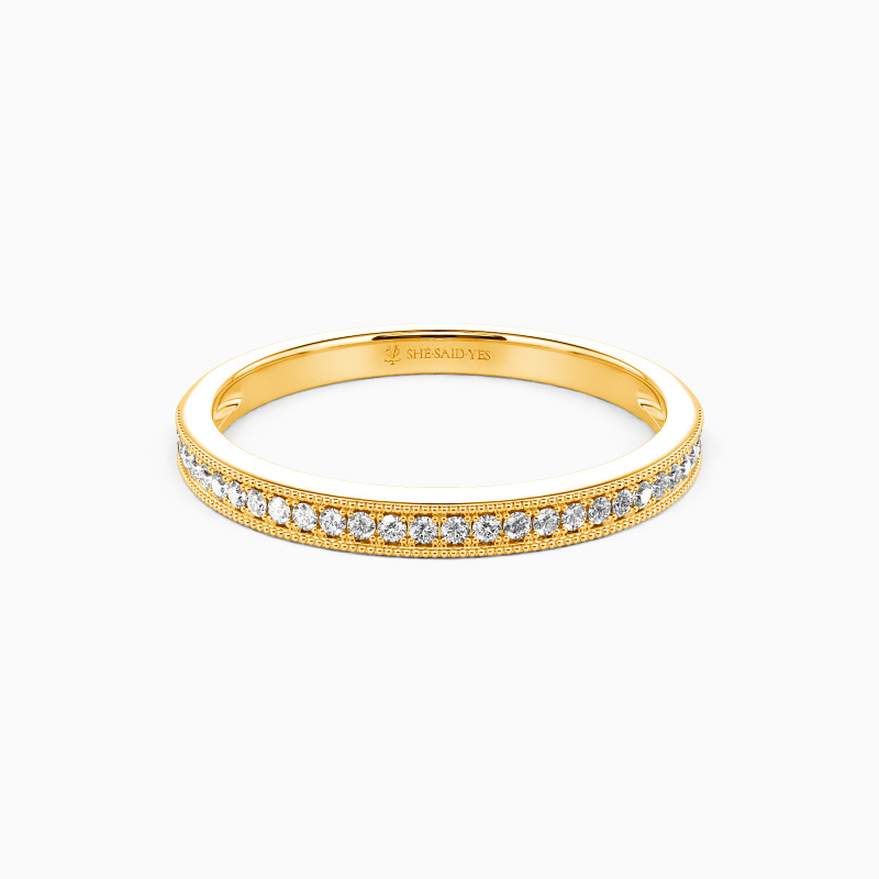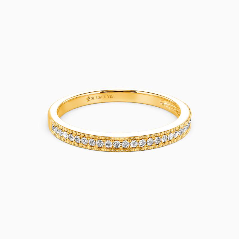 Nothing is more elegant than our striking semi-eternity wedding band. Featuring a row of shimmering round stones, it's surrounded by sophisticated milgrain along the edges. Always the right choice for your big day.