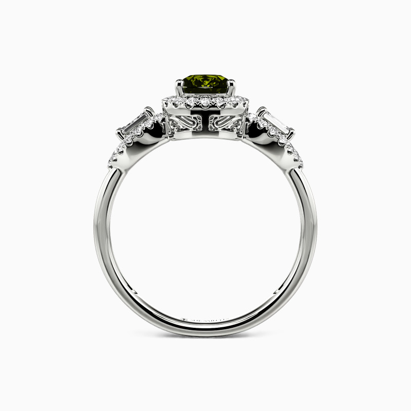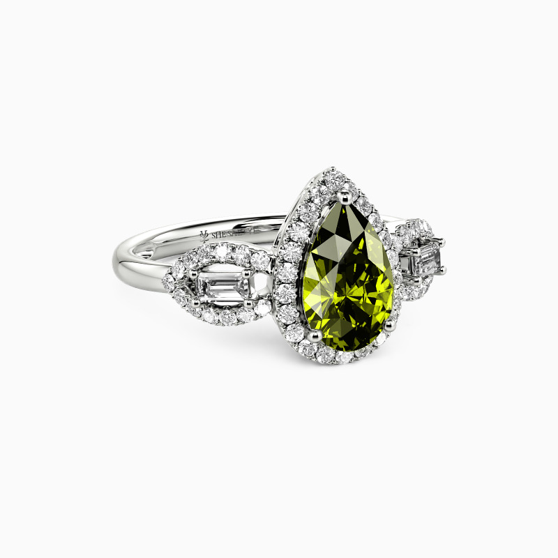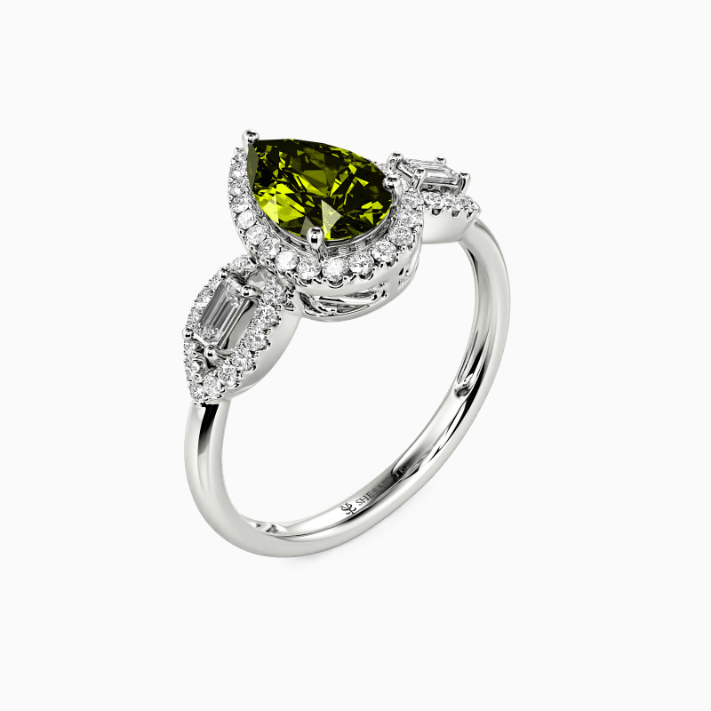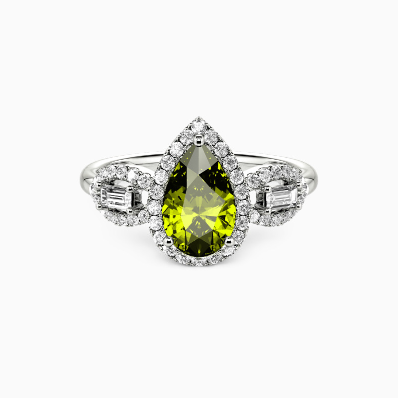 For a sophisticated and elegant bride-to-be. This engagement ring showcases a pear cut center stone framed by shimmery accent gems. Two radiant gems surrounded by a pear shape halo lining the sides added the additional sparkle.