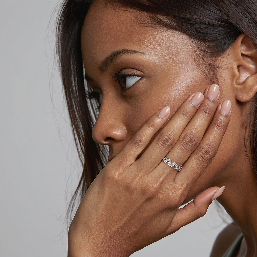 Bring her bridal look to the next level with this enchanting eternity wedding band. This ring showcases several brilliant round-cut accents encrusted in a pavé setting to finish an aesthetic geometric look. It blends a modern and timeless design to captivate your attention. We promised forever with this band and that is what we'll get.