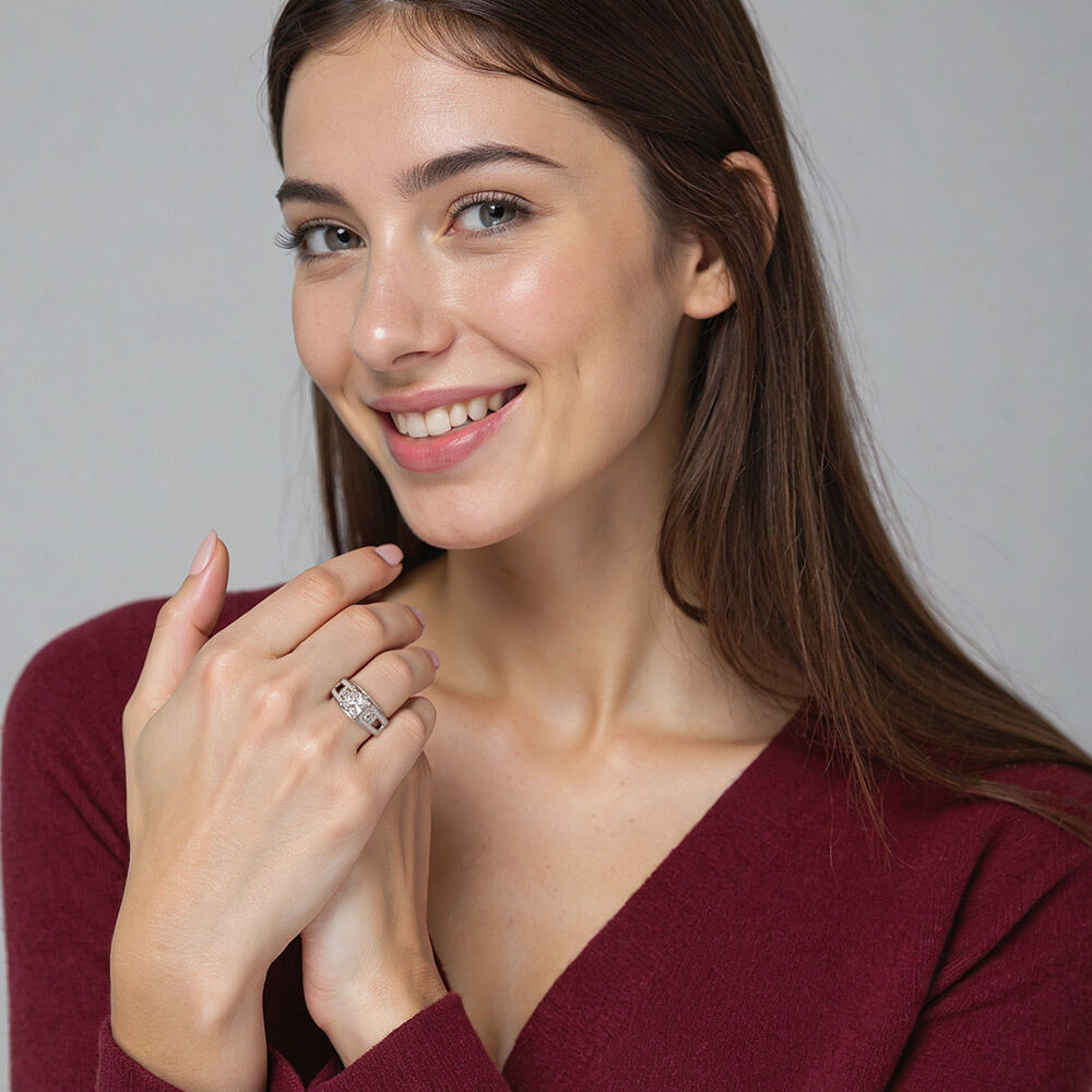 Brilliantly accents in pavé and bezel setting beneath the center stone is what makes this side stone engagement ring gorgeous. In addition, two rows of tiny accents arranged in the split shank surround the princess-cut center stone, making it a more glamorous look. So tell her your love with this ring, for now, tomorrow and always.
