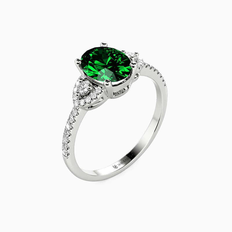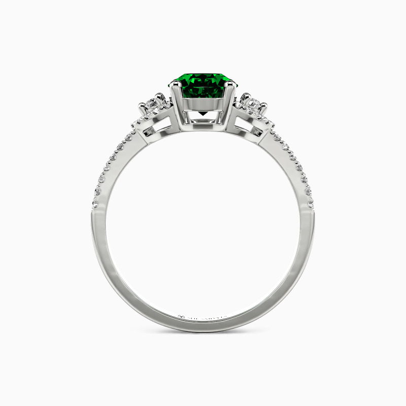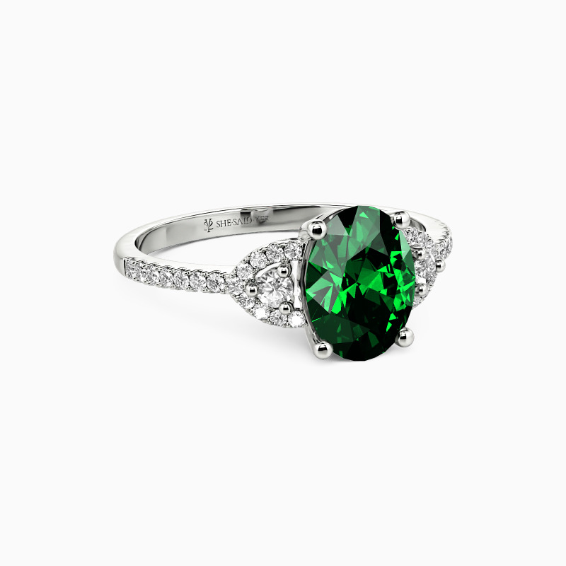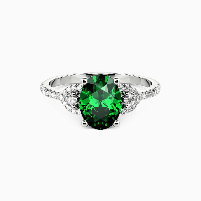 This three-stone engagement ring features a striking oval-cut center stone framed by two precisely cut brilliant round stones, providing the highest possible radiance level. Lined with sparkling accents for standout shine. You'll see why we adore this one.