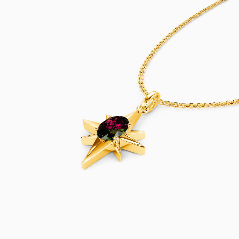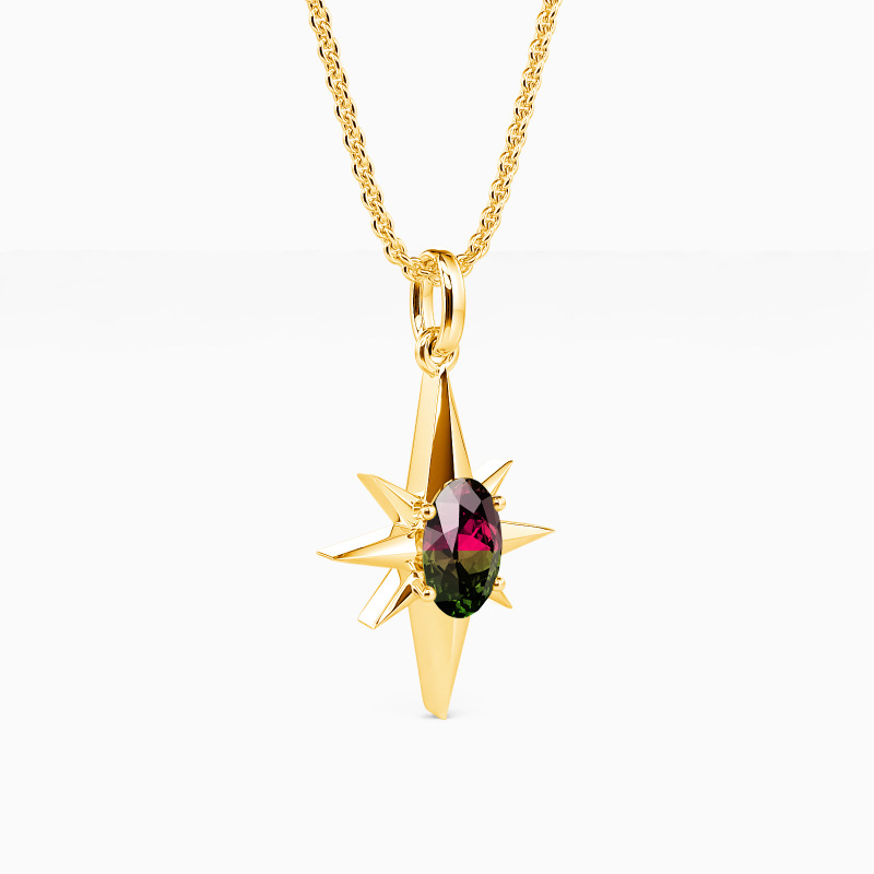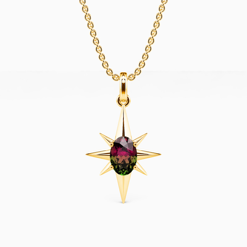 Chic and fabulous. This eight-point star pendant necklace symbolizes hope and guidance and is the ideal everyday accessory. It features a glimmering oval-cut gem in the center that emits the shining metallic rays from eight directions. This striking piece will lighten your day and save you from the darkness.