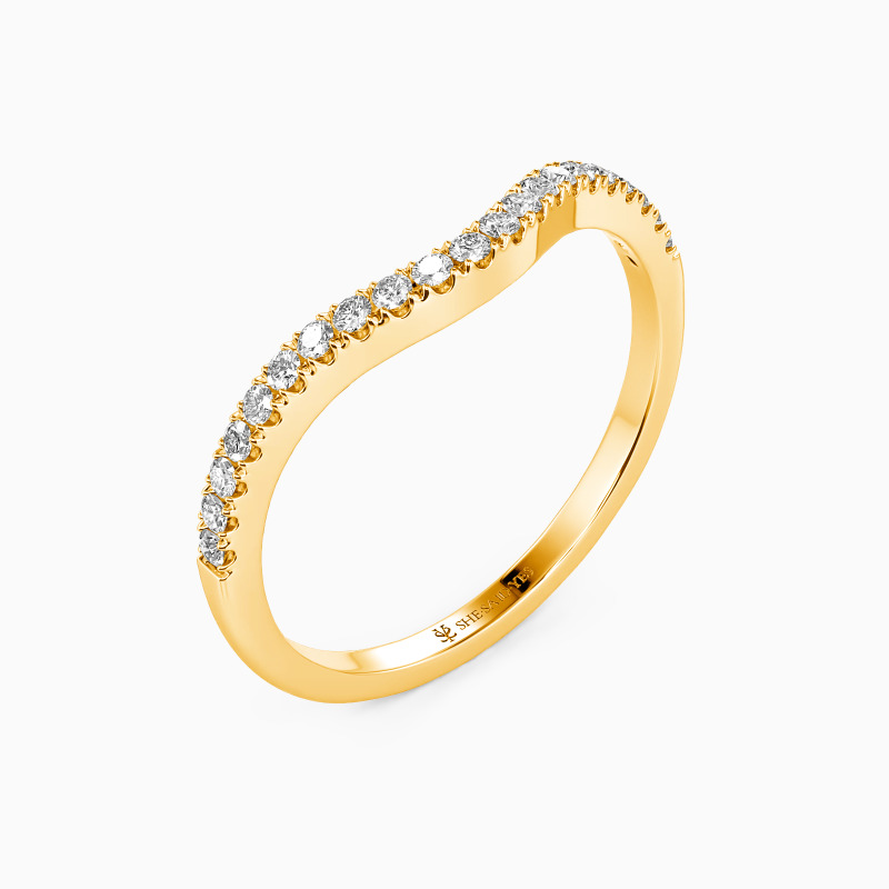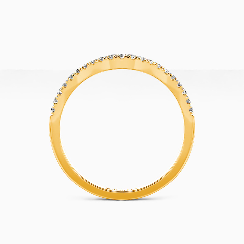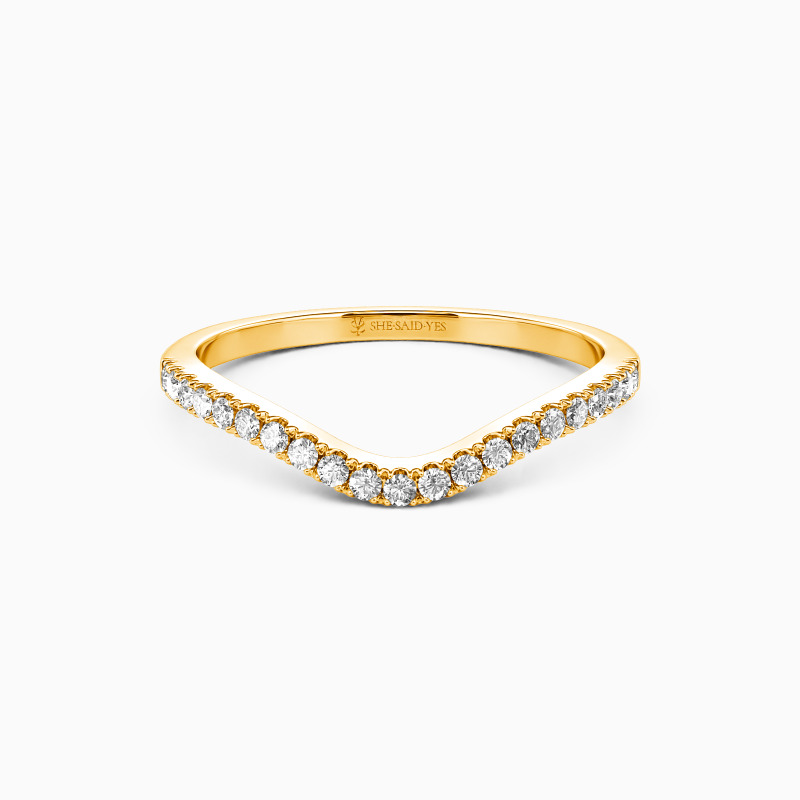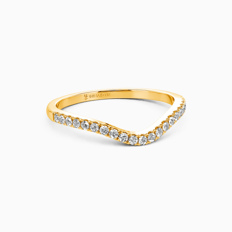 Classical and dainty. This brilliant wedding band is paved with shiny round stones and curved in an elegant way in the middle. Easily paired with any of your outfits, it dazzles from every angle.