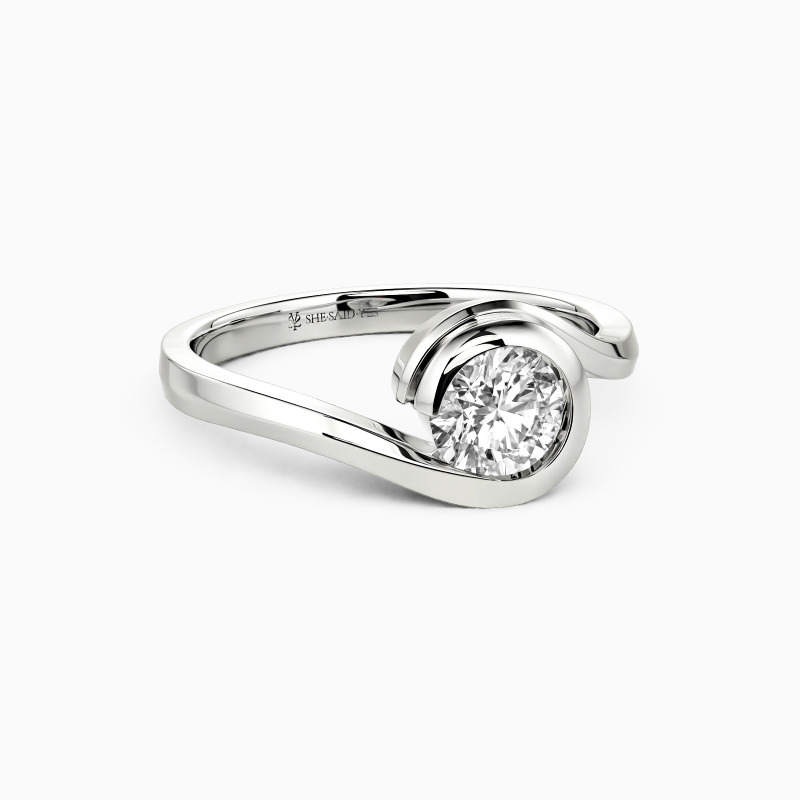 The wavy design will show you the curvaceous beauty of our delicate engagement ring. Featuring a twinkling round gem in the middle entirely wrapped by a precious bezel extended from the flowing shank, this contemporary look defines your compelling charisma and sculpts the message of eternal love.