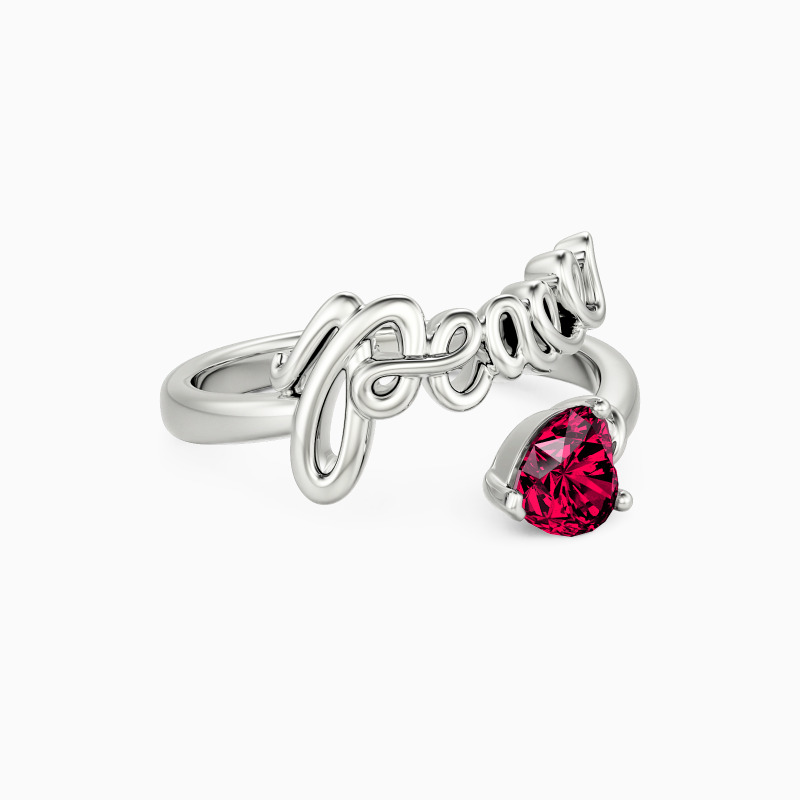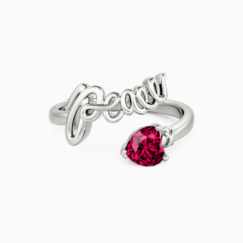 Meaningful, yet exceptional. This sleek metal ring celebrates infinite peace with a handwritten word of peace and a delicate heart-shaped stone. Keep peace in your heart forever. Live in harmony, peaceful in the world.