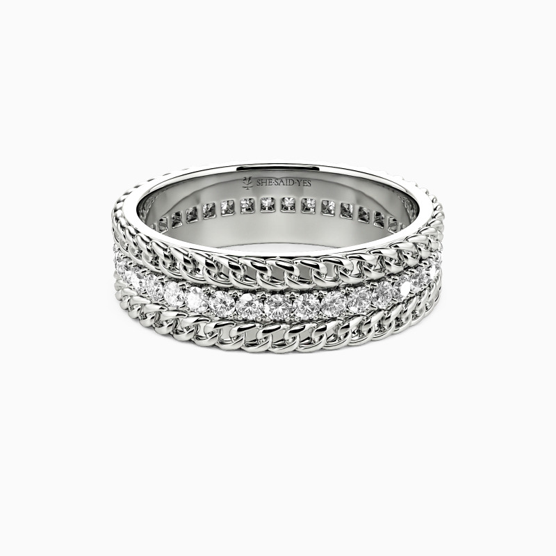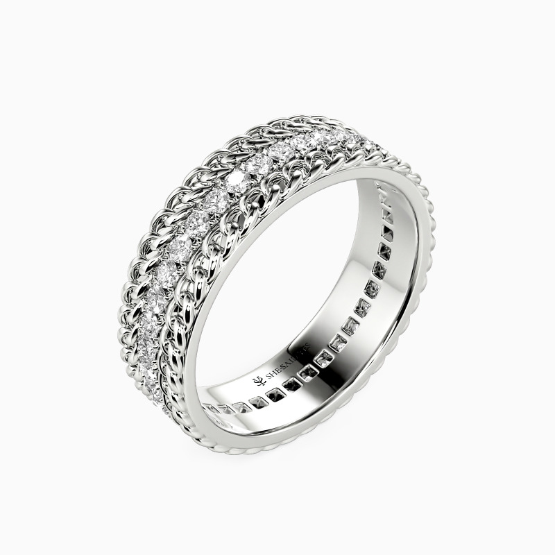 Unmatched in beauty and design, this eternity band is a petite look she’ll wear often. It showcases a line of glistening stones set in the middle of the shank to create a sparkling look. Two rope design ribbons are sculptured on the shank. It is designed to be comfortable for daily wear. If I was a love poet, my first poem would be about our love.