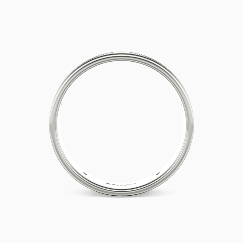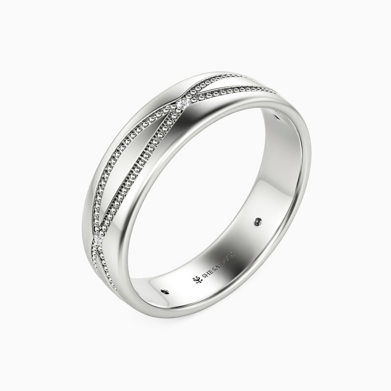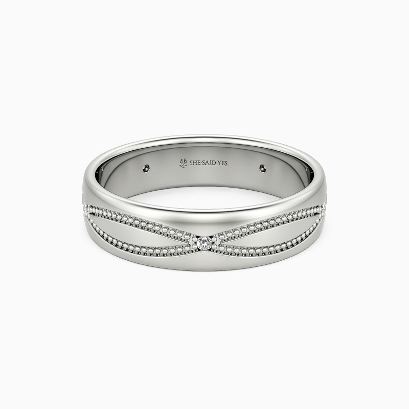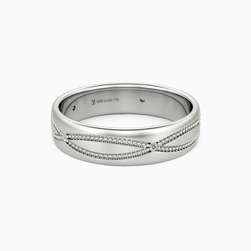 Simple and chic. This dainty wedding band is sculptured with double milgrain curves twisting on the buffed finish, dotted with several little gleaming stones in each intersection, creating a timeless charm and a bright gloss of metal. To relay your affection with this divine wedding band must be a delightful choice.