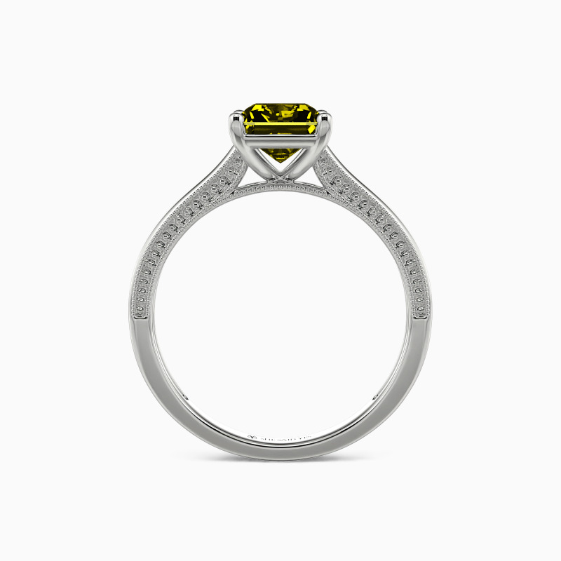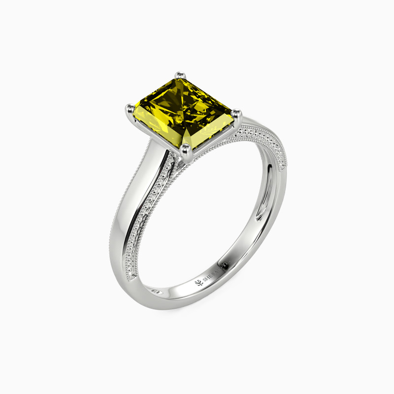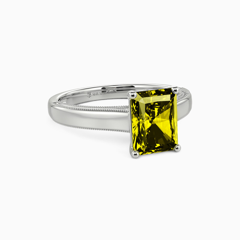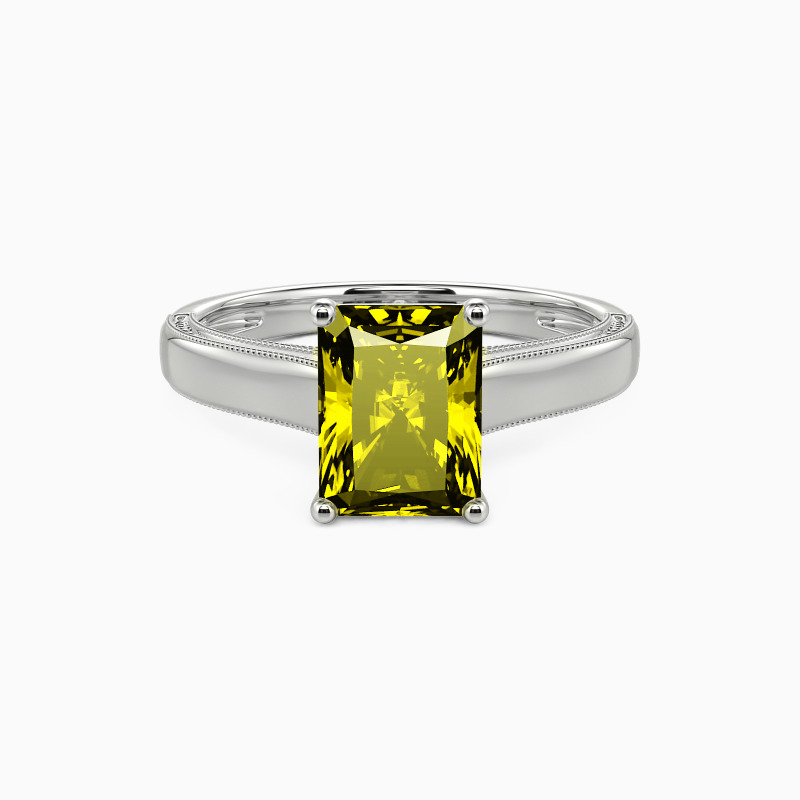 This solitaire ring displays a dazzling and sophisticated radiant-cut stone, flaunting effortless elegance in a timeless and alluring design. A single radiant-cut stone sits in four prongs, showcasing its breathtaking color and clarity. The polished shank is spattered with a petite milgrain pattern that ties the ring together perfectly. I promise to love you forever, every single day of forever.