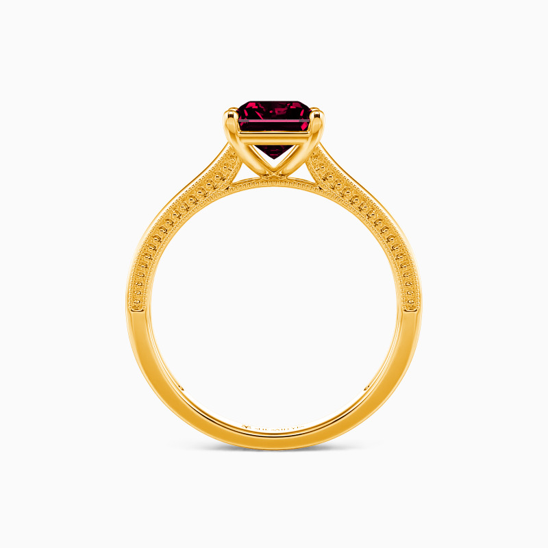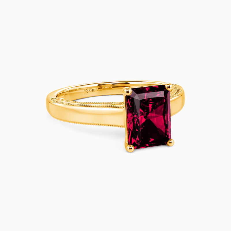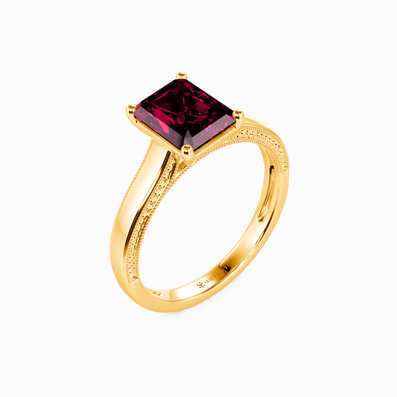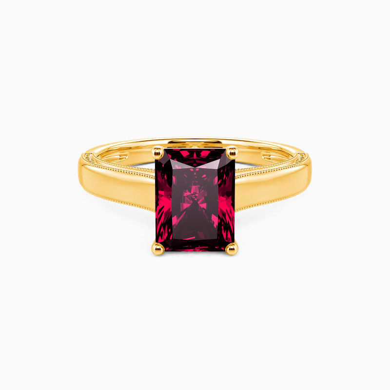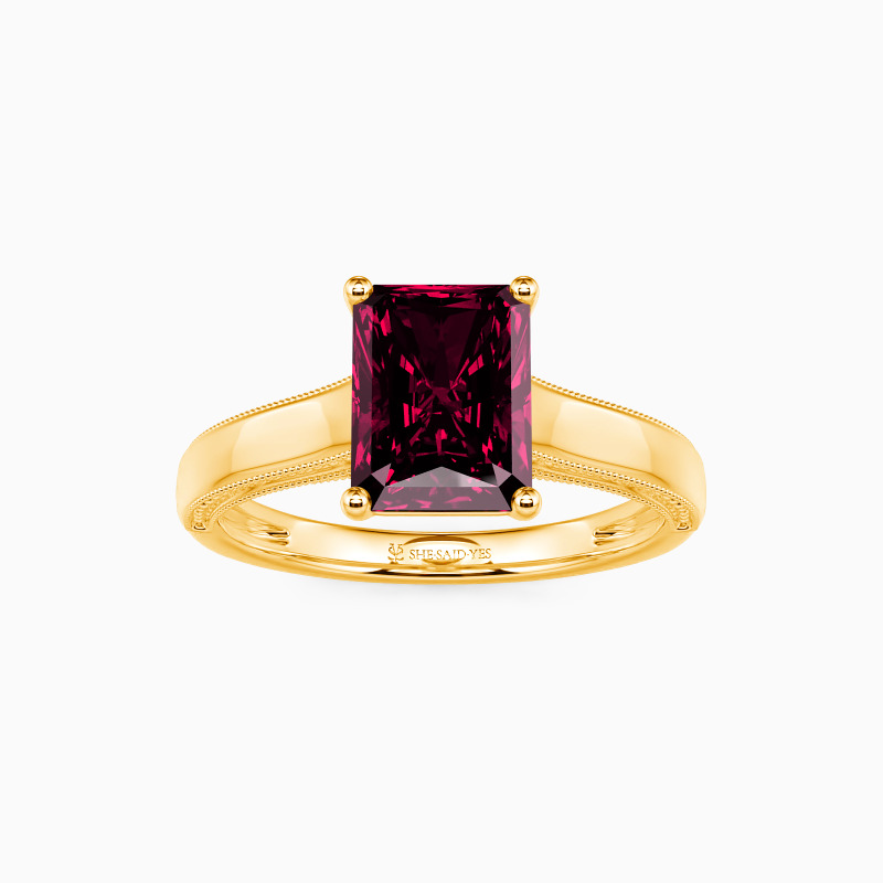 This solitaire ring displays a dazzling and sophisticated radiant-cut stone, flaunting effortless elegance in a timeless and alluring design. A single radiant-cut stone sits in four prongs, showcasing its breathtaking color and clarity. The polished shank is spattered with a petite milgrain pattern that ties the ring together perfectly. I promise to love you forever, every single day of forever.