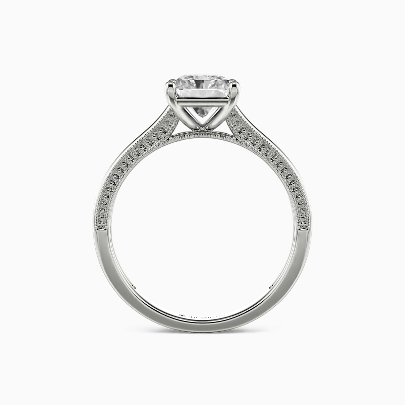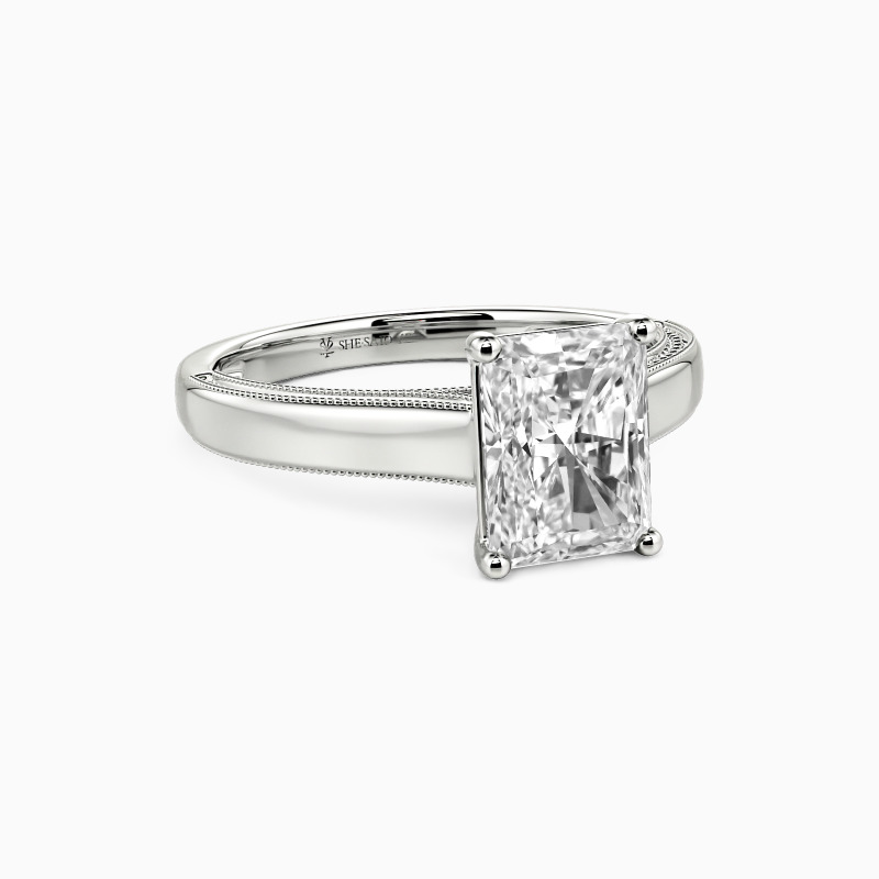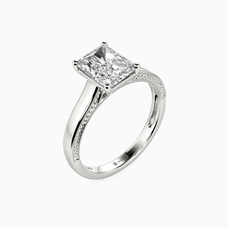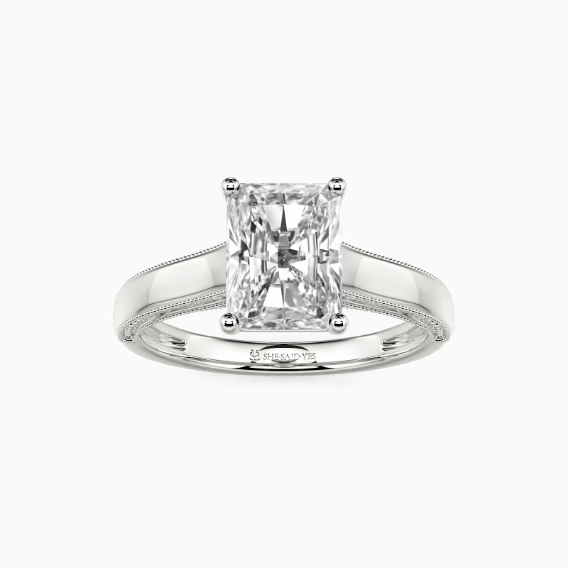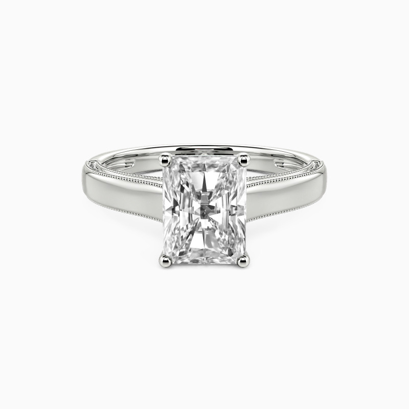 This solitaire ring displays a dazzling and sophisticated radiant-cut stone, flaunting effortless elegance in a timeless and alluring design. A single radiant-cut stone sits in four prongs, showcasing its breathtaking color and clarity. The polished shank is spattered with a petite milgrain pattern that ties the ring together perfectly. I promise to love you forever, every single day of forever.
