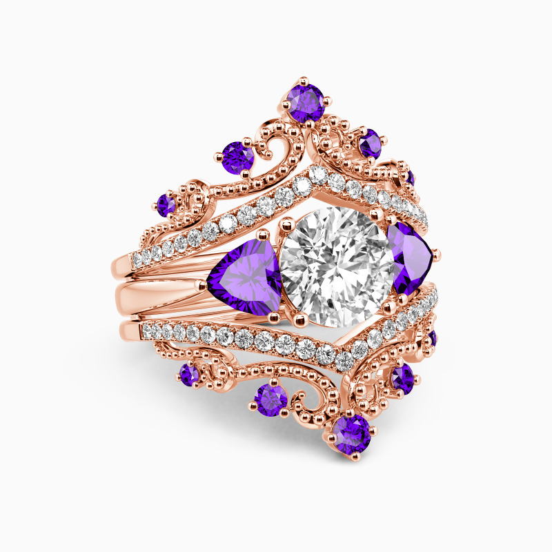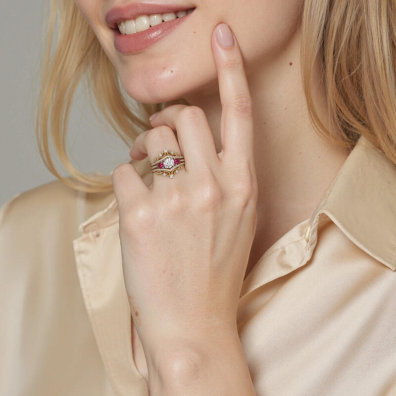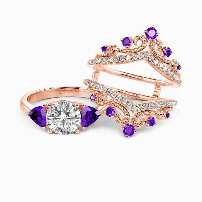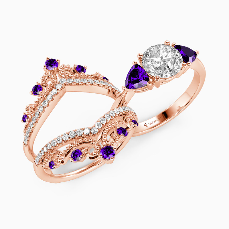 Drawing inspiration from vintage looks, this bridal set features a round-cut stone set up in the middle, and two Trillion-cut side stones flank each shoulder, highlighting the glistening center. Matching the magnificent crown shape enhancer that sparkles oppositely, this piece catches the charming glamour of romantic queens, the best gift to complete her ideal wedding.