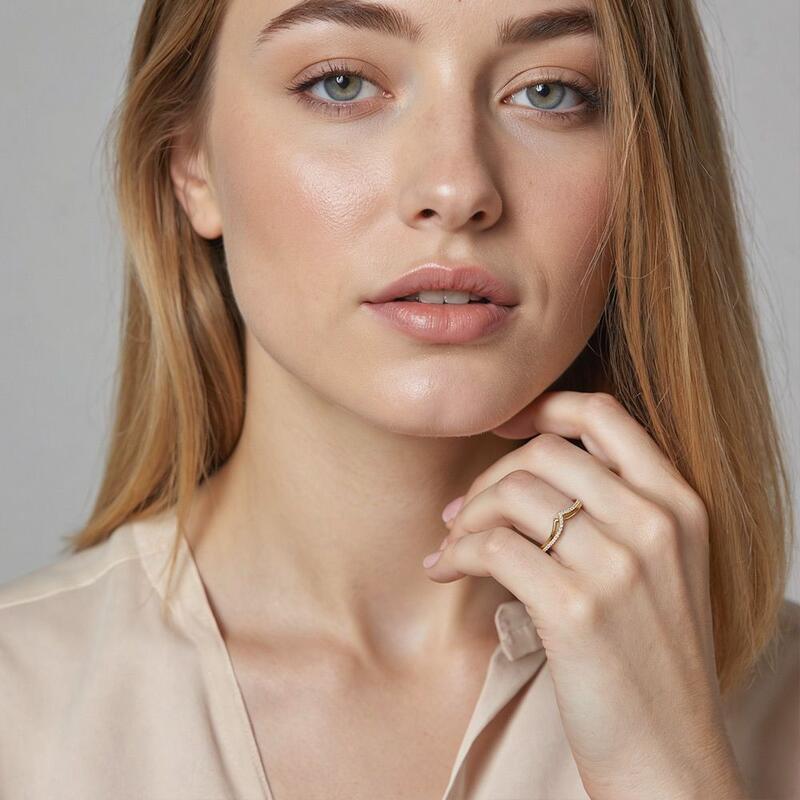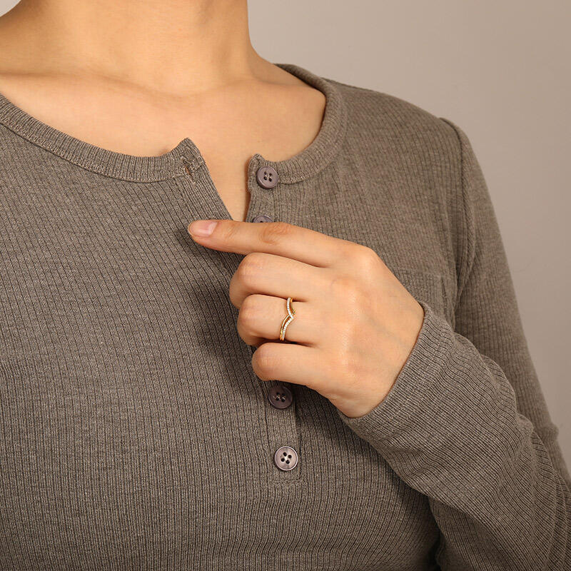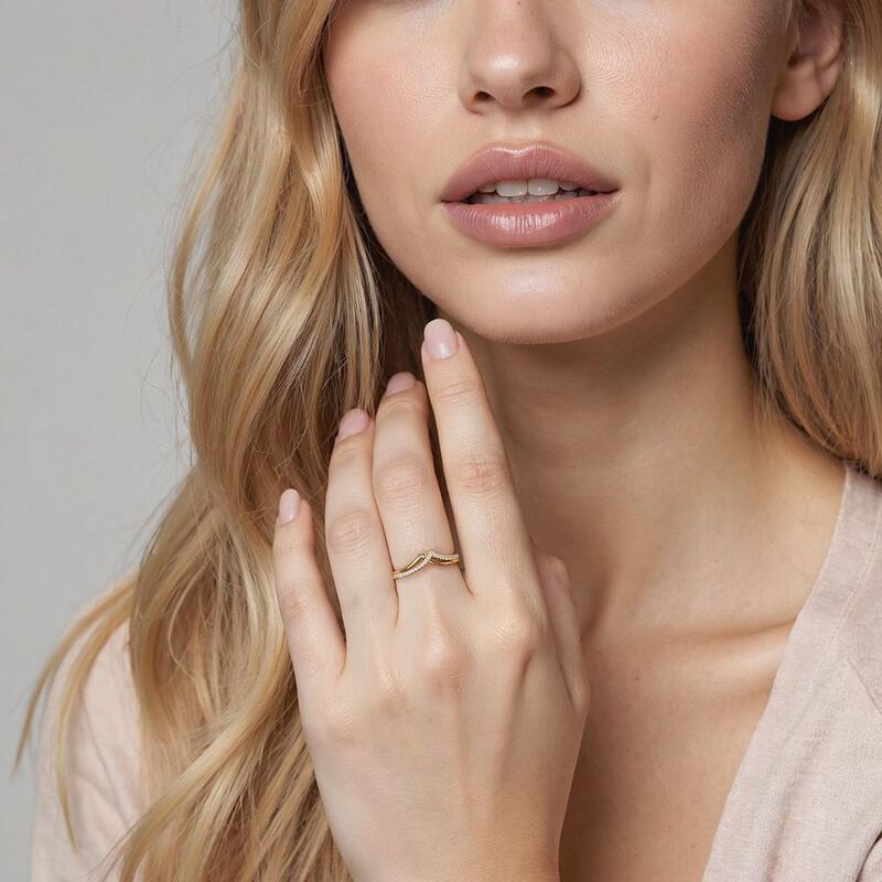 Unique and elegant. Featuring the overlapping double V-shaped shank, formed by polished ribbon and paving stones, it shows the vivid profile of the mountains, accentuating the distinctive design of this special piece. Wearing it solo or pairing it with other pieces from SHE·SAID·YES gives you a charming impression.