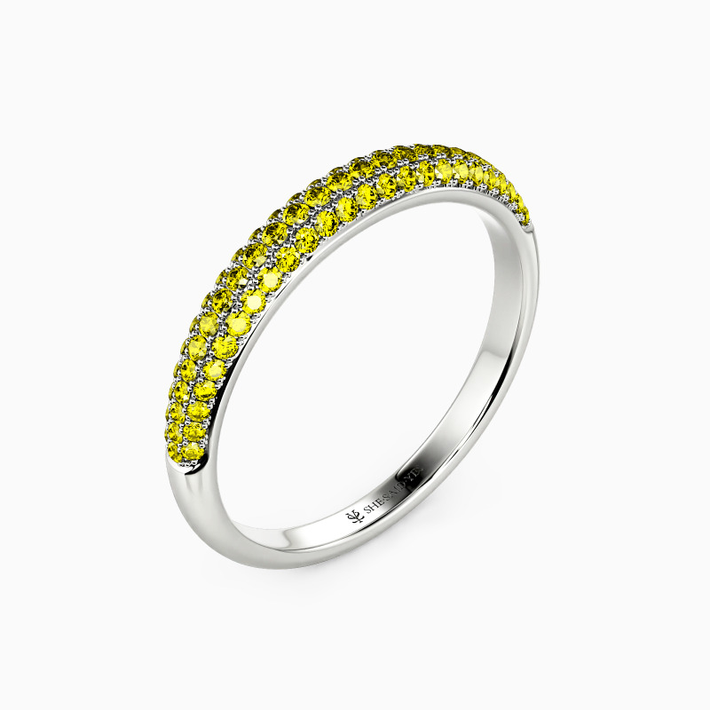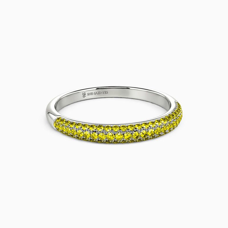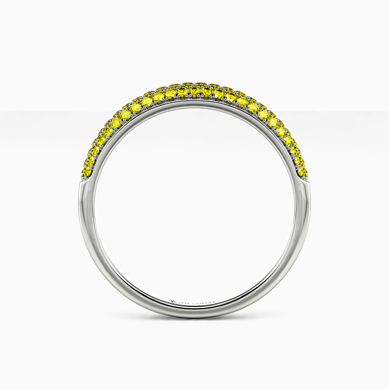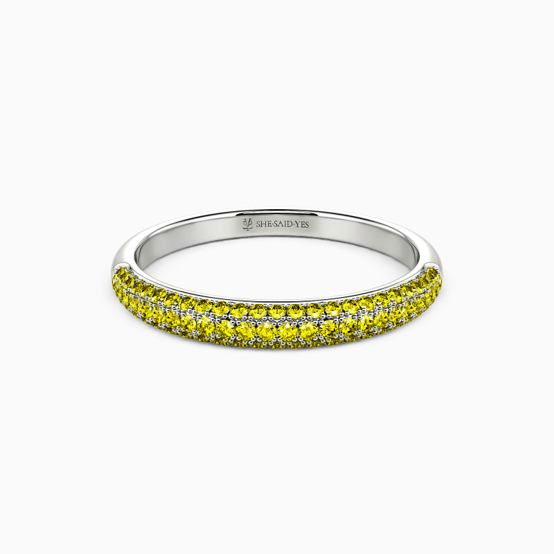 Minimalist and timeless. A piece of a stunning wedding band is lifetime jewelry to cherish. Featuring a series of round stones on the slight domed shank, it creates a sparkling radiance to fulfill her beauty.