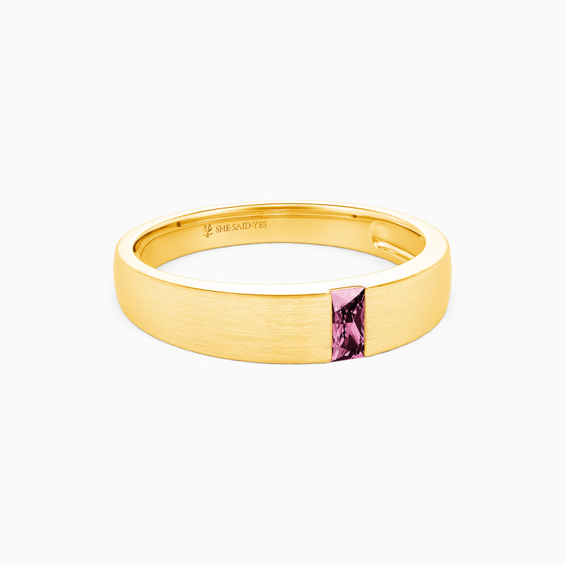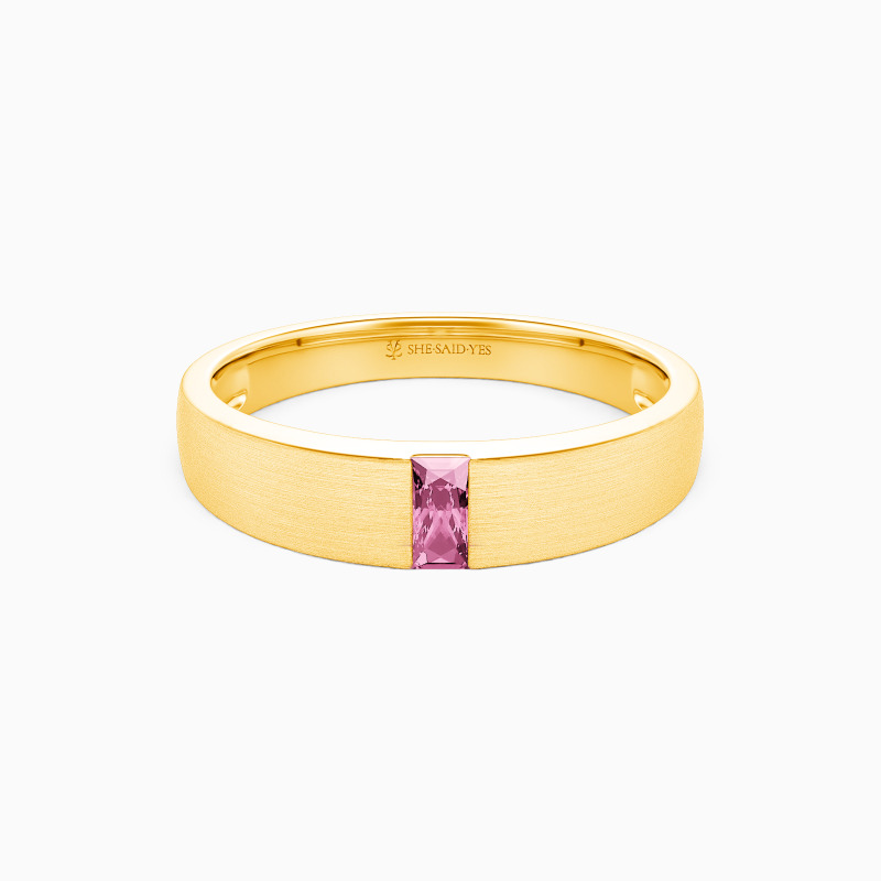Simple yet stylish. Existing in the minimalist design and modern style, this wedding band features an emerald-cut gem in the tension setting on the matte shank. With the flat edges at all points, this precious piece from SHE·SAID·YES will provide you with comfort and a touch of masculinity.