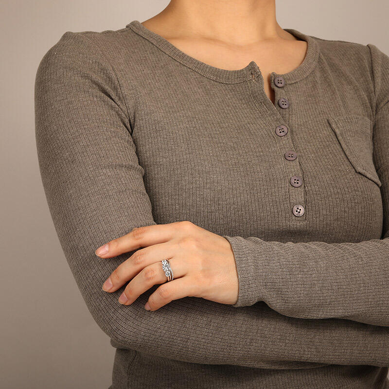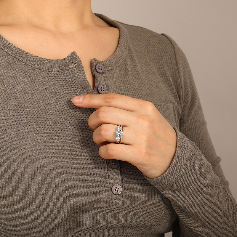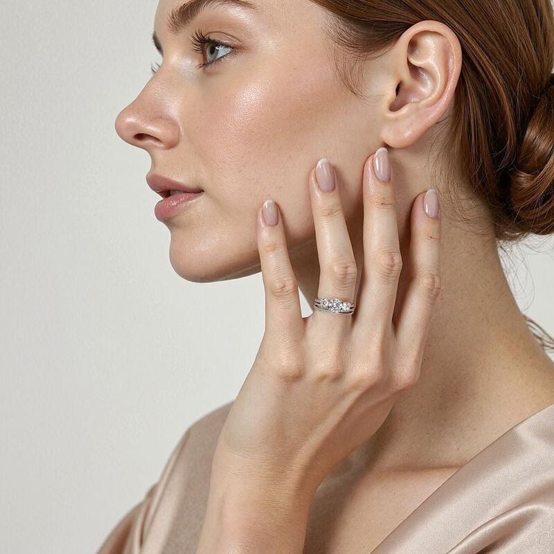 For the bride searching for effortless radiance, look no further than this wedding set from SHE·SAID·YES. A brilliant center stone is nestled within four-prong claws, accented with two sparkling round stones on each side; delicate twisting matching bands-one is paved, and the other is polished, completing this special look.