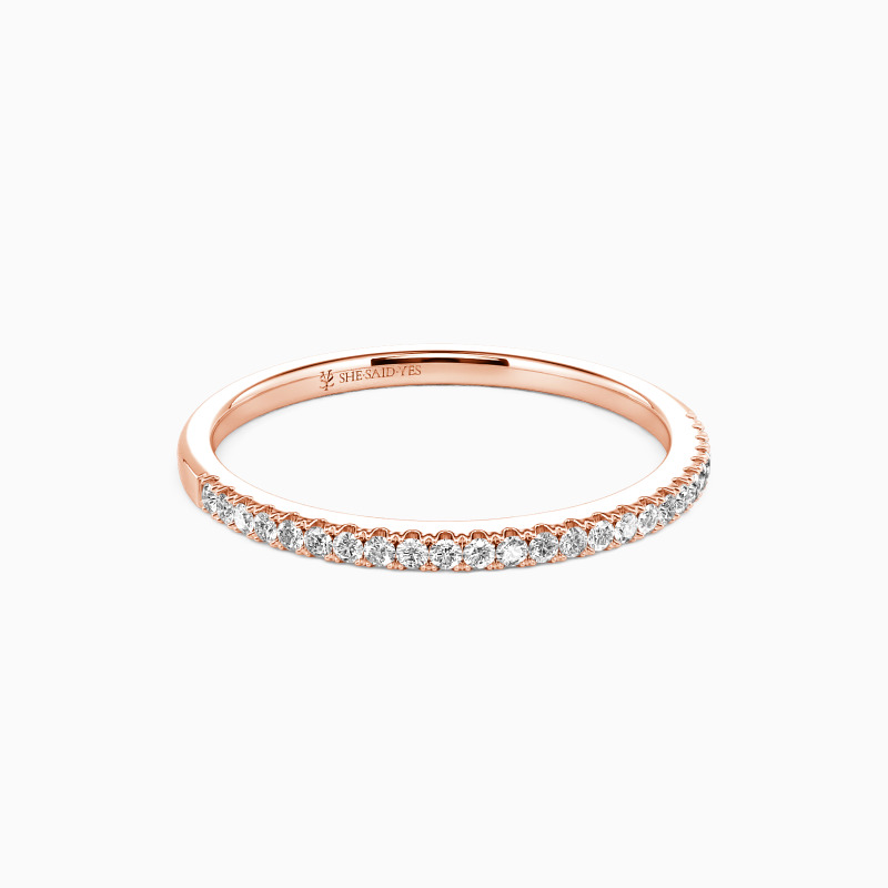 A truly classic wedding ring lined with sparkling stones in a shared prong setting. This gorgeous ring is sure to capture her heart with this elegant design and brilliant stones. Also great as an anniversary band or a stacker ring.