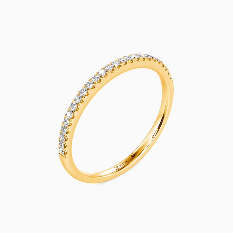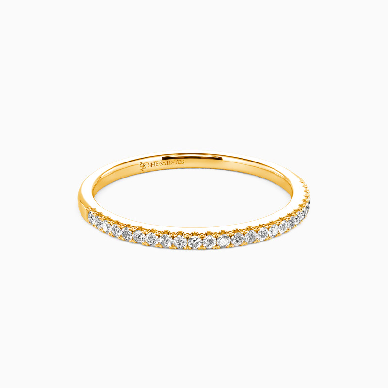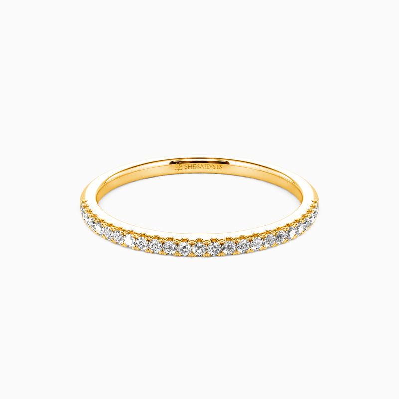A truly classic wedding ring lined with sparkling stones in a shared prong setting. This gorgeous ring is sure to capture her heart with this elegant design and brilliant stones. Also great as an anniversary band or a stacker ring.