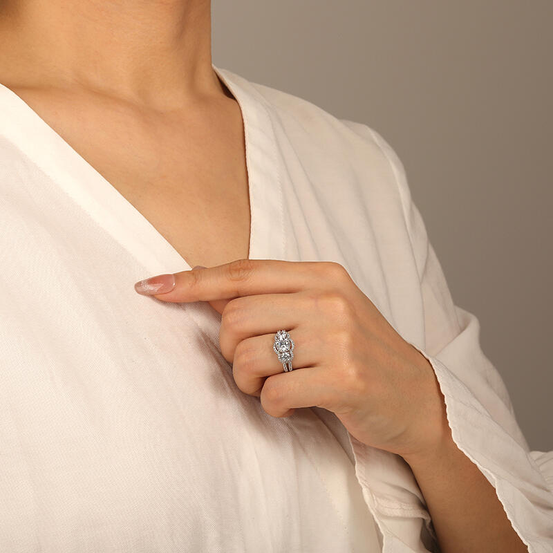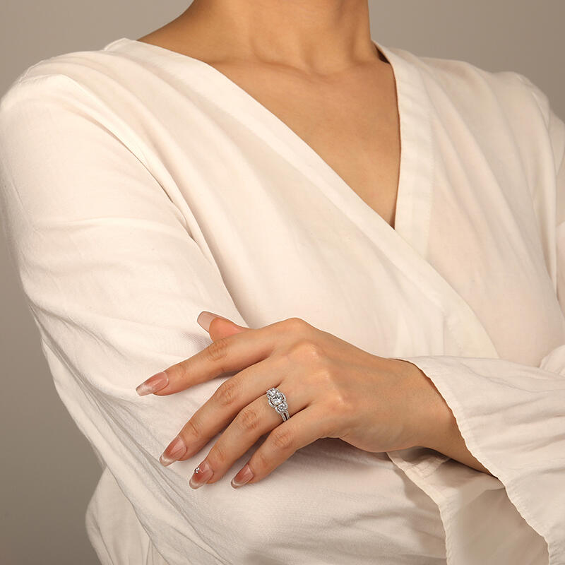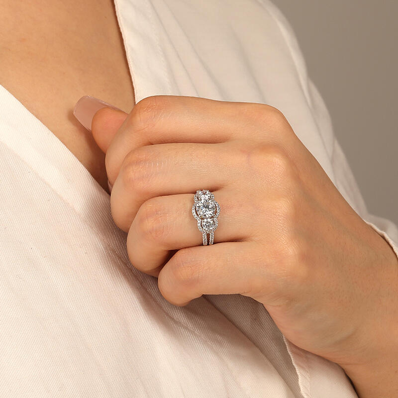 Transcending time, a ring that has it all. Our three-stone halo engagement ring will blow you away. A trio of round stones is elegantly wrapped in sparkling halos. Accent detailing on the split shank adds even more brilliance. Simply breathtaking, which will never be wrong for your beloved one.