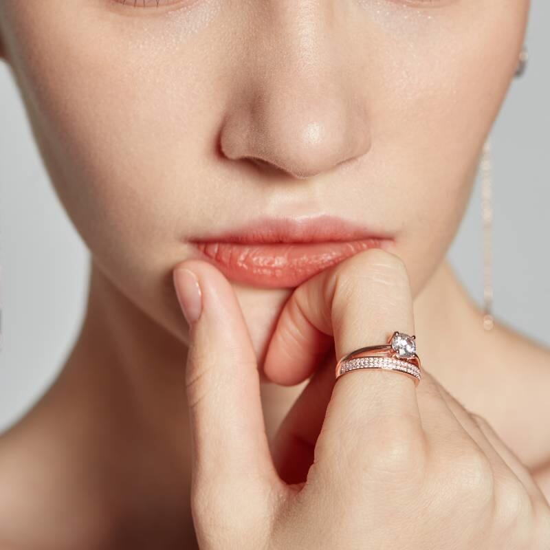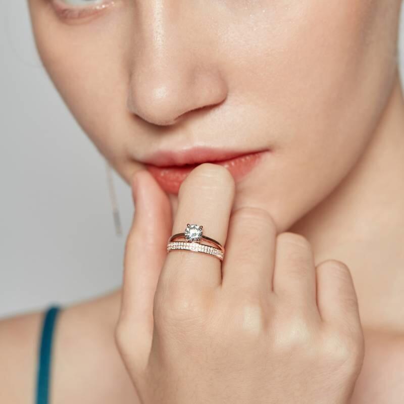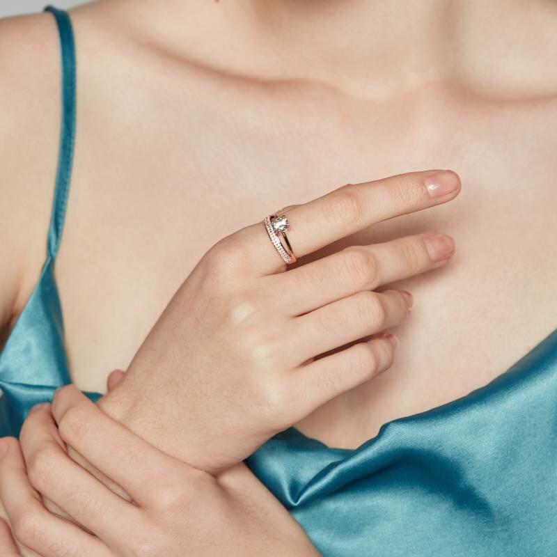 This side stone engagement ring unveils a round-cut stone held in the center on a polished shank to create a brilliance look. Two rows of small sparkling round shaped stones aligned in a pavé setting help showcase your glamour. Take this ring as the beginning of a happy chapter of your life.