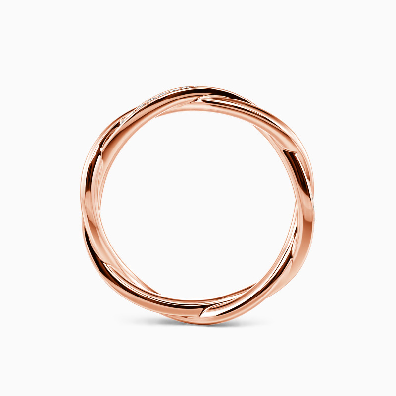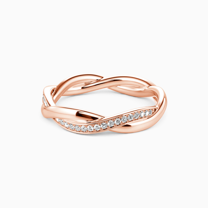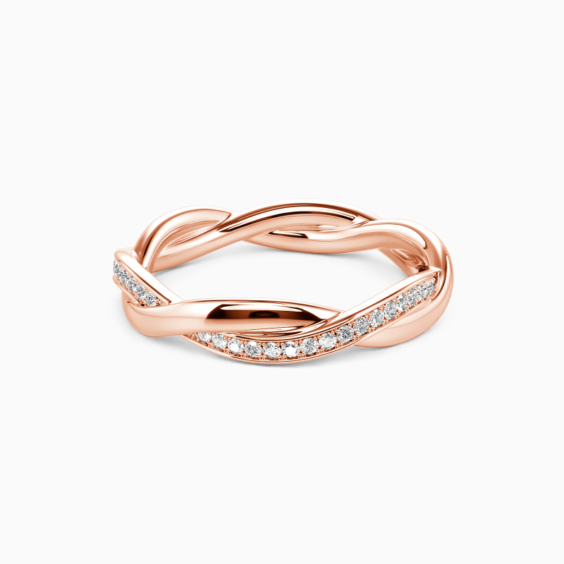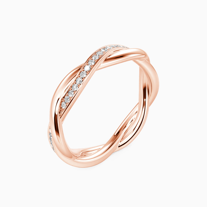 This twisted wedding band charms you with a fine sequence of tiny scintillating round-cut stones studded in a channel setting and another polished metallic shank adds more brilliance to the whole look. Whether for everyday wear or stacking it for an event, you should not miss it.