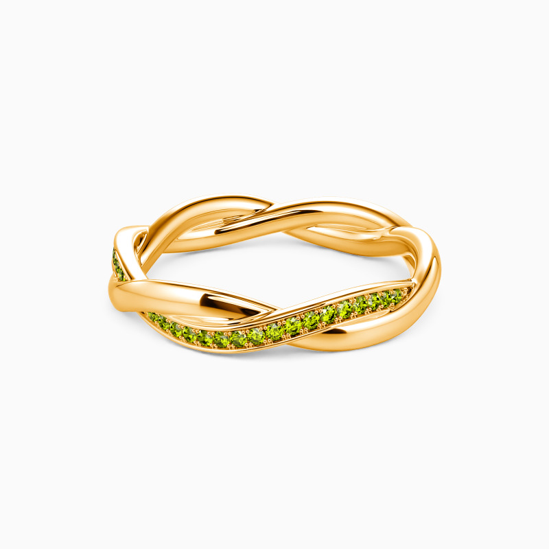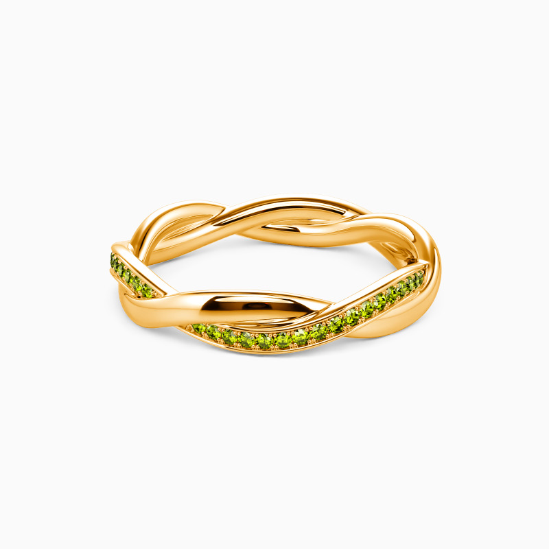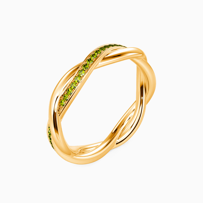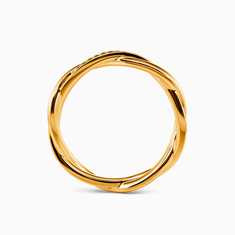 This twisted wedding band charms you with a fine sequence of tiny scintillating round-cut stones studded in a channel setting and another polished metallic shank adds more brilliance to the whole look. Whether for everyday wear or stacking it for an event, you should not miss it.