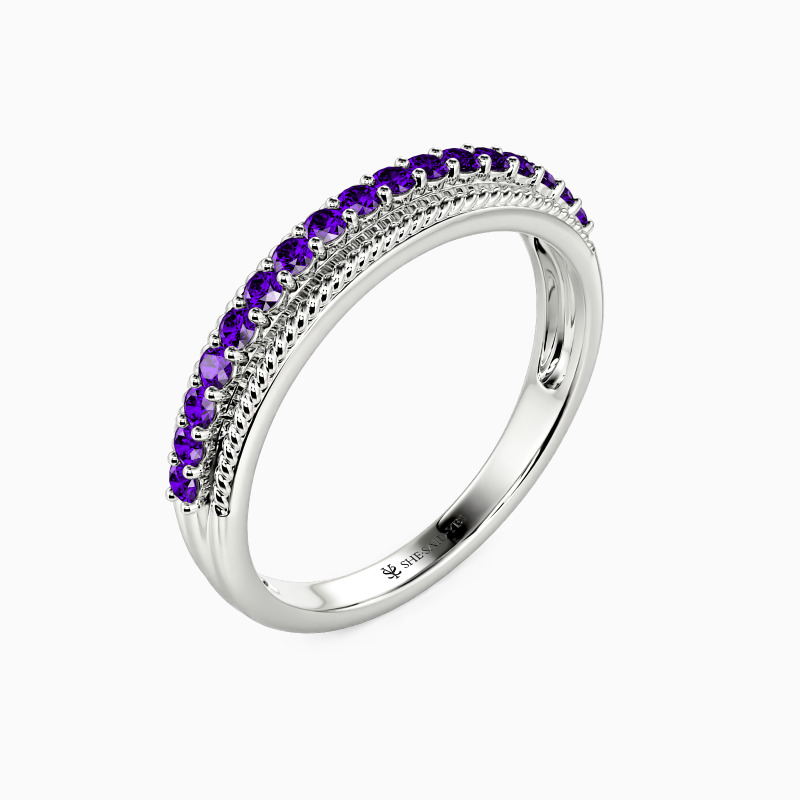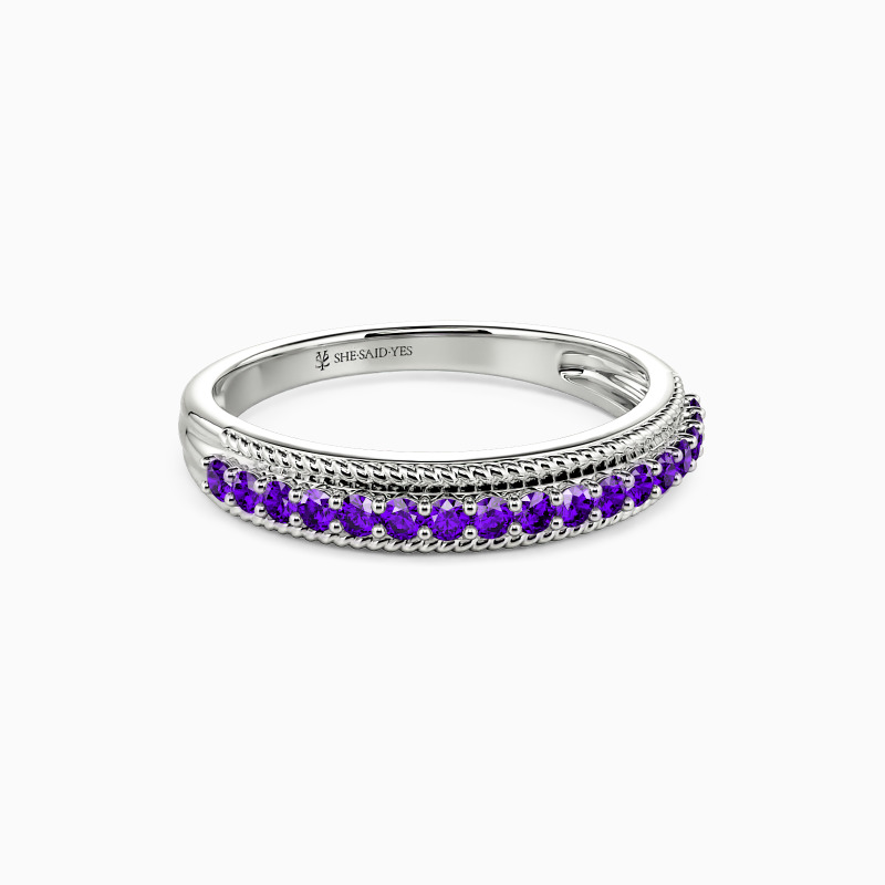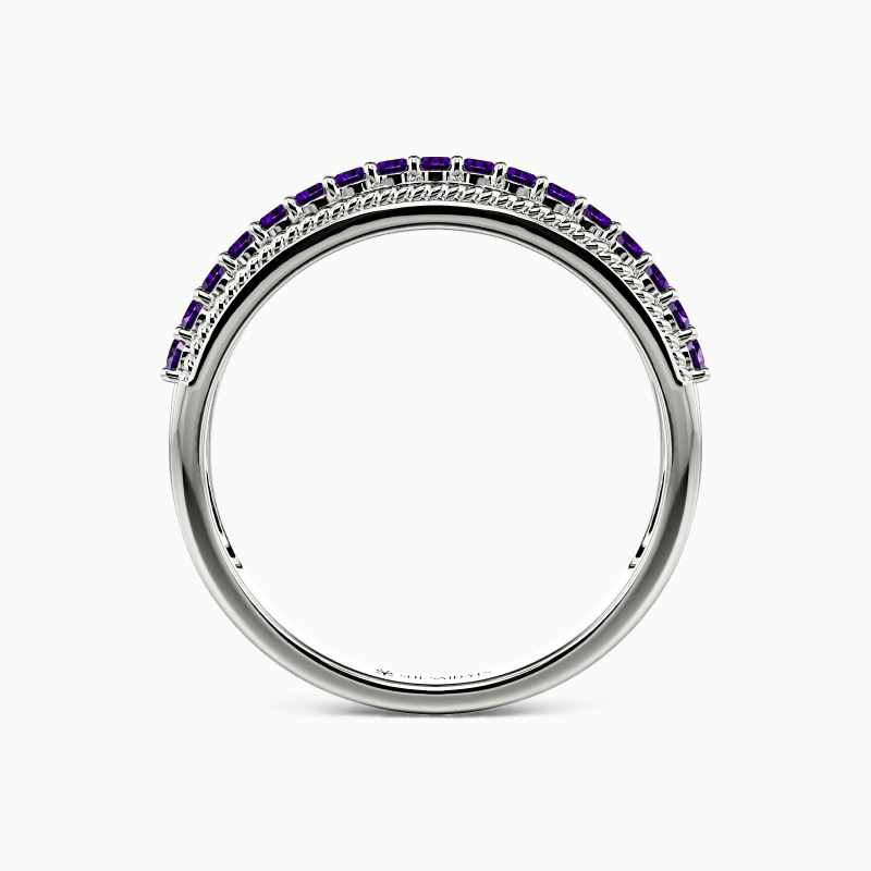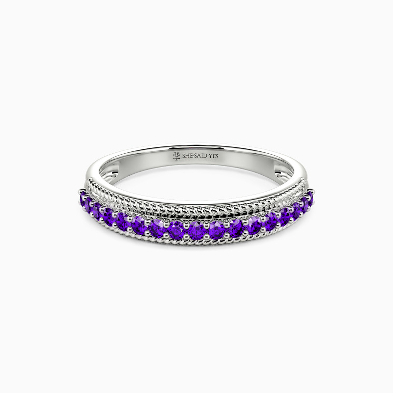 Contemporary design for the chic bride-to-be. Many scintillating round-cut stones in a pavé setting showcase the flawless brilliance of the ring. And two rows of braided patterns on the edges of the shank bring a touch of intricacy to this wedding band. Making it aesthetic to stack with your engagement ring or as a standalone wedding ring.