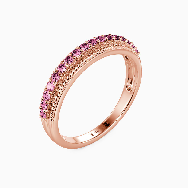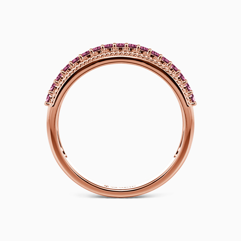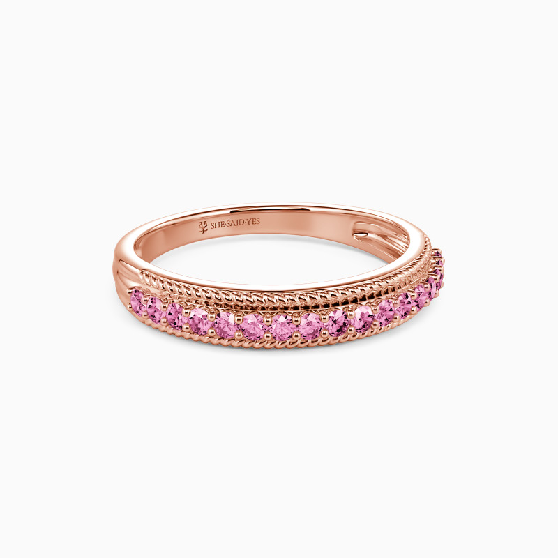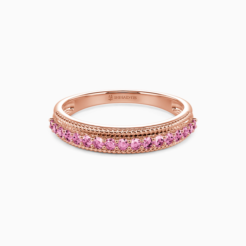 Contemporary design for the chic bride-to-be. Many scintillating round-cut stones in a pavé setting showcase the flawless brilliance of the ring. And two rows of braided patterns on the edges of the shank bring a touch of intricacy to this wedding band. Making it aesthetic to stack with your engagement ring or as a standalone wedding ring.