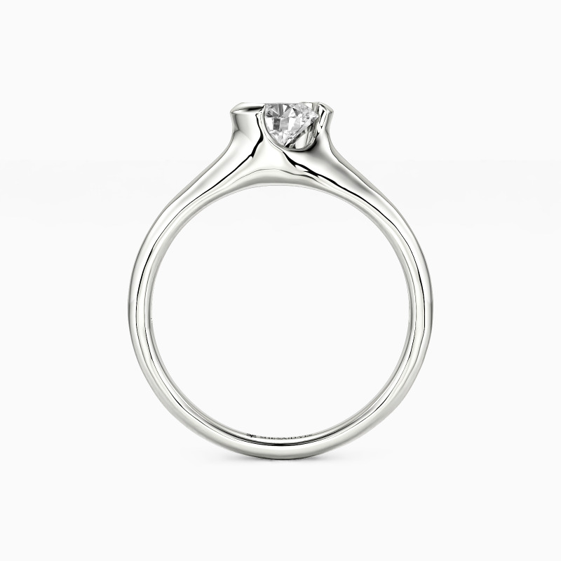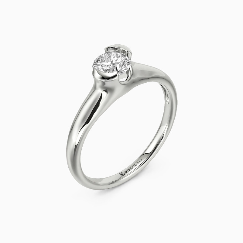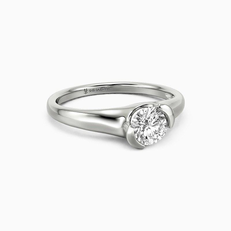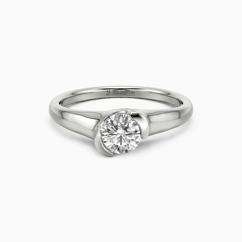 As a classic modern engagement ring, this dainty piece features a gleaming round-cut stone in the middle, wrapped by a precious unsymmetrical half-bezel, secretly revealing a touch of sheen to show your unique contemporary style.